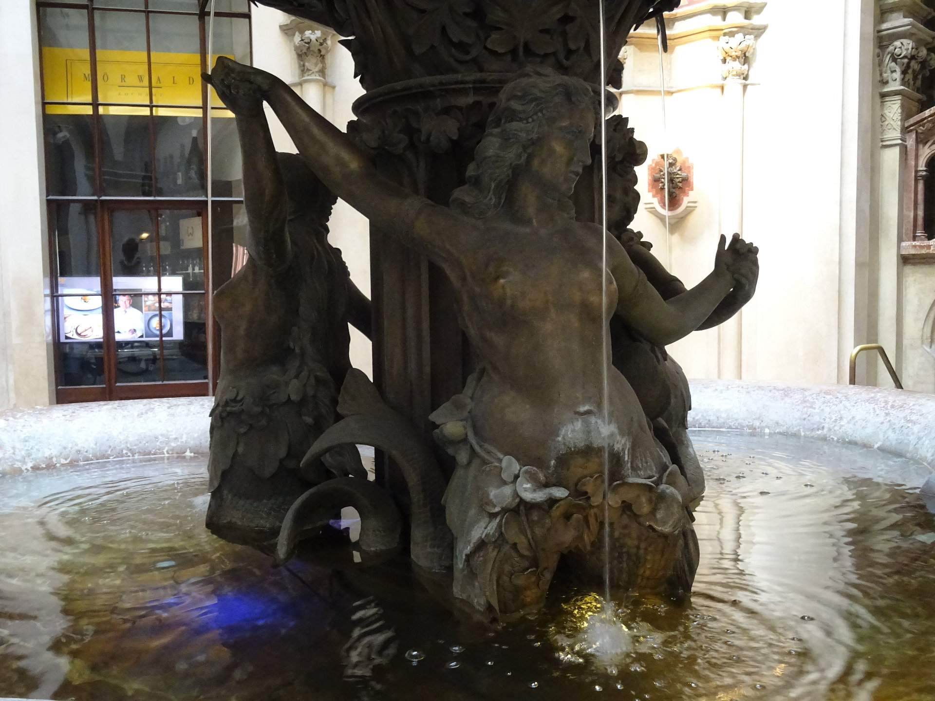 Aus dem Wasser des Marmorbeckens tauchen drei Nixen auf, die