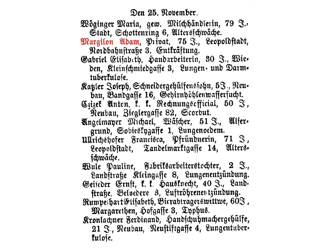 Privatier, † 25.11.1864 im 75 Lebensjahre, Leopoldstadt, Nordbahnstraße 3.