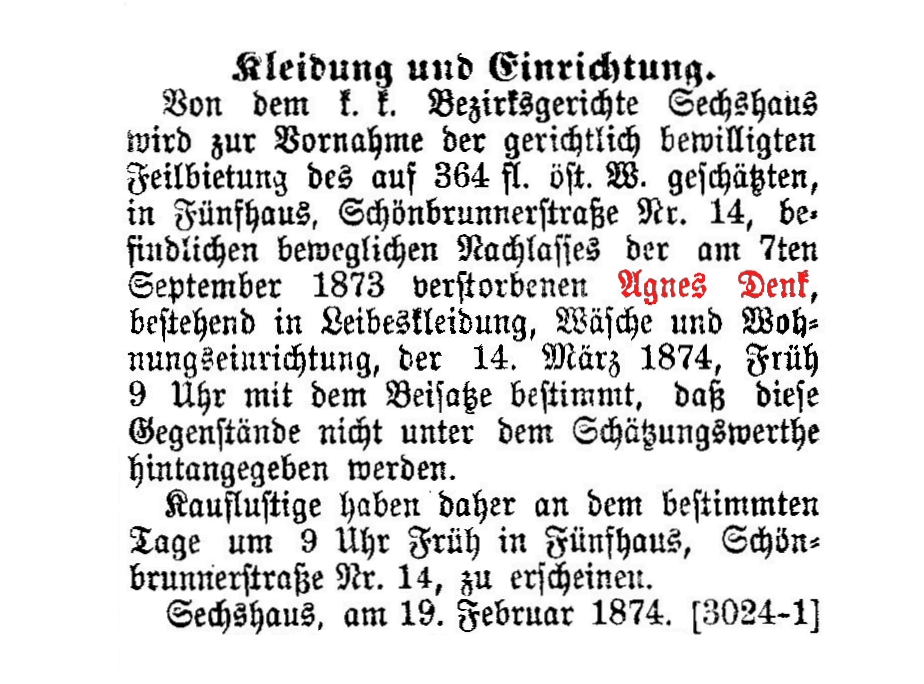 Expedits-Direktion-Adjunct im k.k. Finanz-Ministerium, Laurenzerg. 5, † 4.2.1873, 75 J.