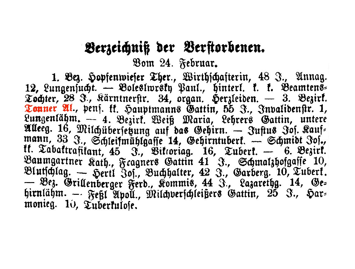 k.k. Schätzmeistergattin und Hauseigentümerin, 20.01.1873 im 67. LJ., Landstraße, Steingasse Nr. 25, (Fremden-Blatt vom 23.1.1873, Seite 15), Gatte: Franz Polaczek, k.k. Schätzmeister.