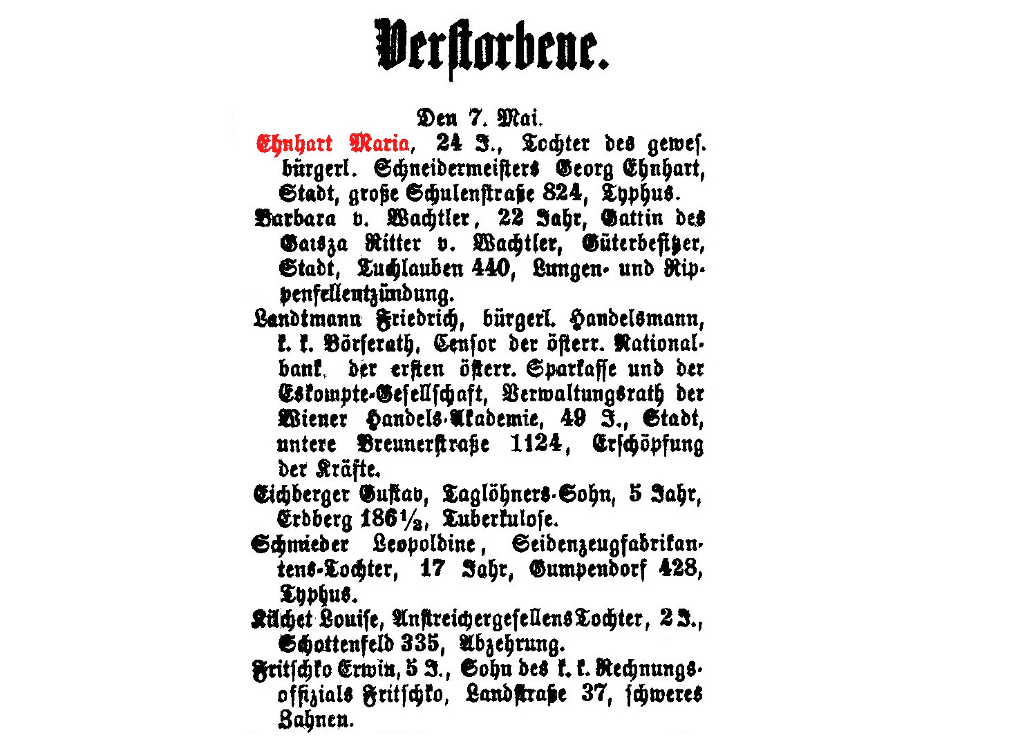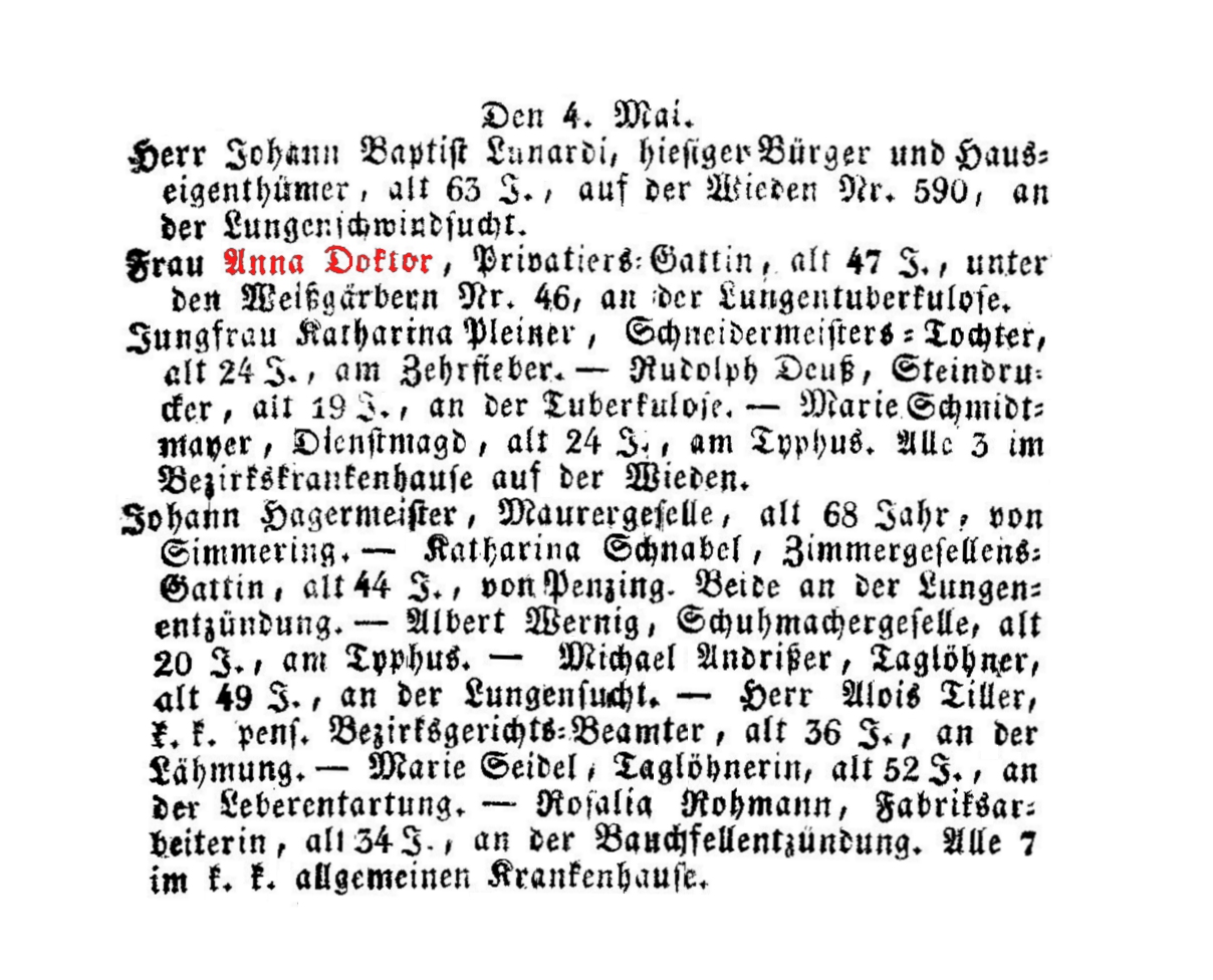 Privatiers-Gattin, † 04.05.1852, 47 Jahre, Unter den Weißgärbern Nr. 46, an der Lungentuberkulose.