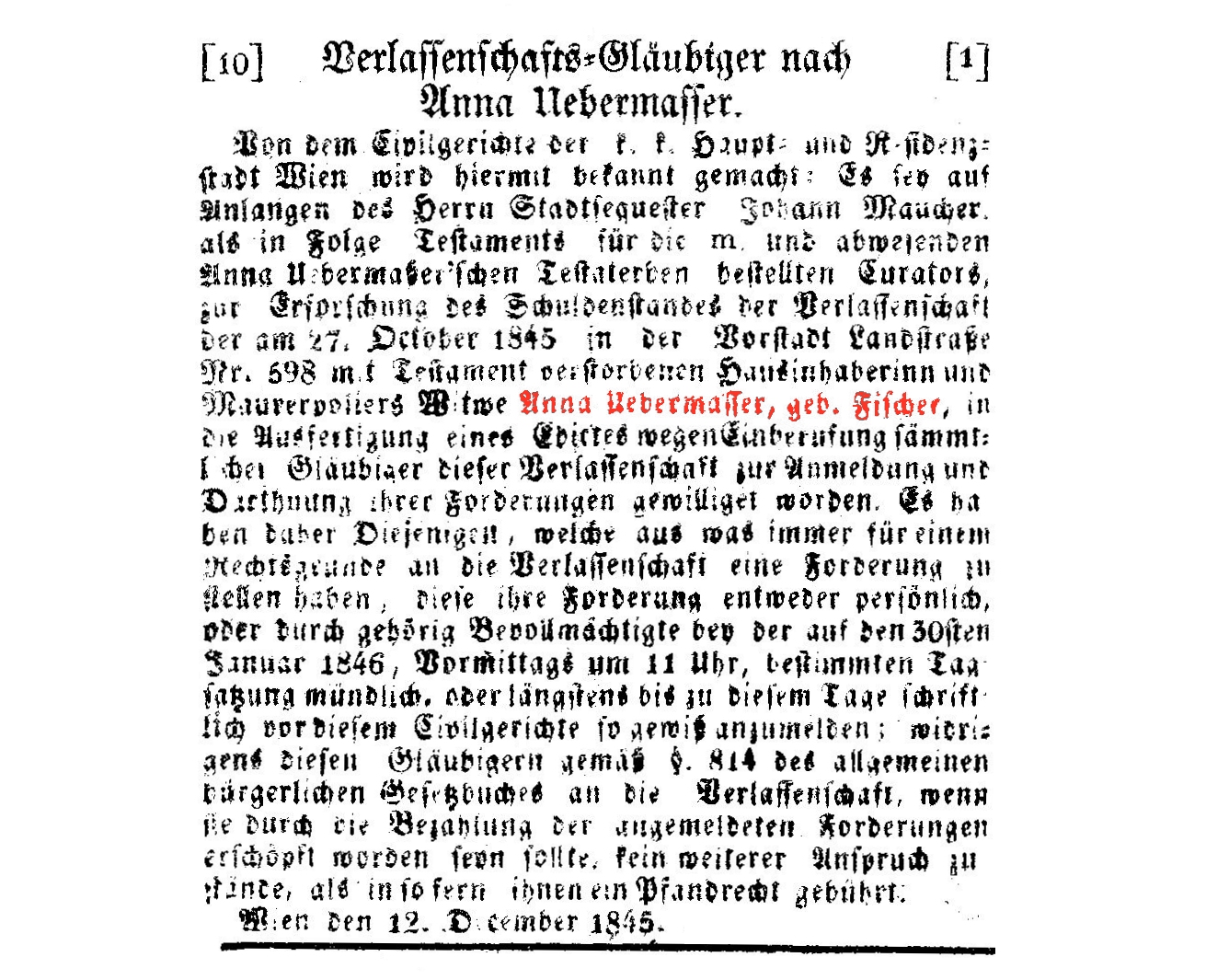 = Todesanzeige (der Wiener Zeitung, Neue Freie Presse usw.)