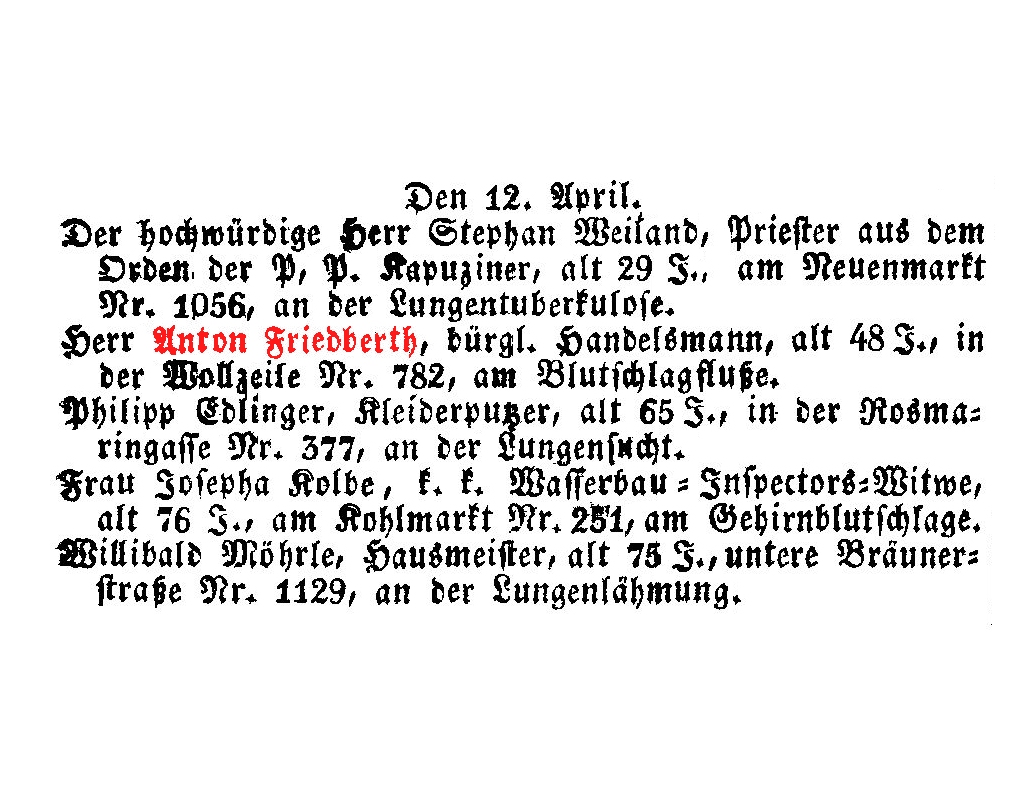 Laurenzergasse 715, † 31.7.1852 an Typhus.
