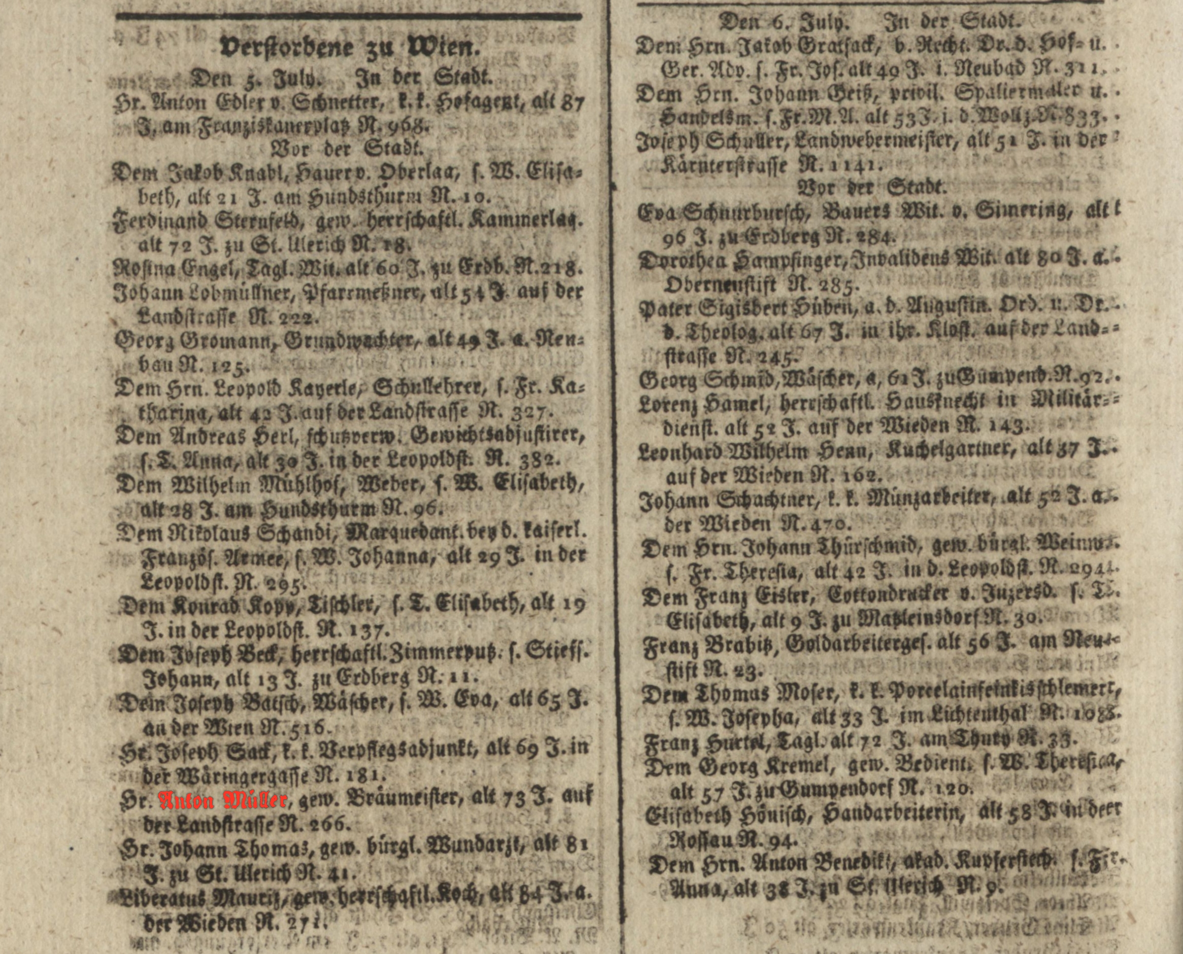 gewesener bürgl. Bräumeister und Hausinhaber auf der Landstraße Nr. 266, † 05.07.1809 im 73. LJ., Gattin Magdalena Müller, geb. Ernst,