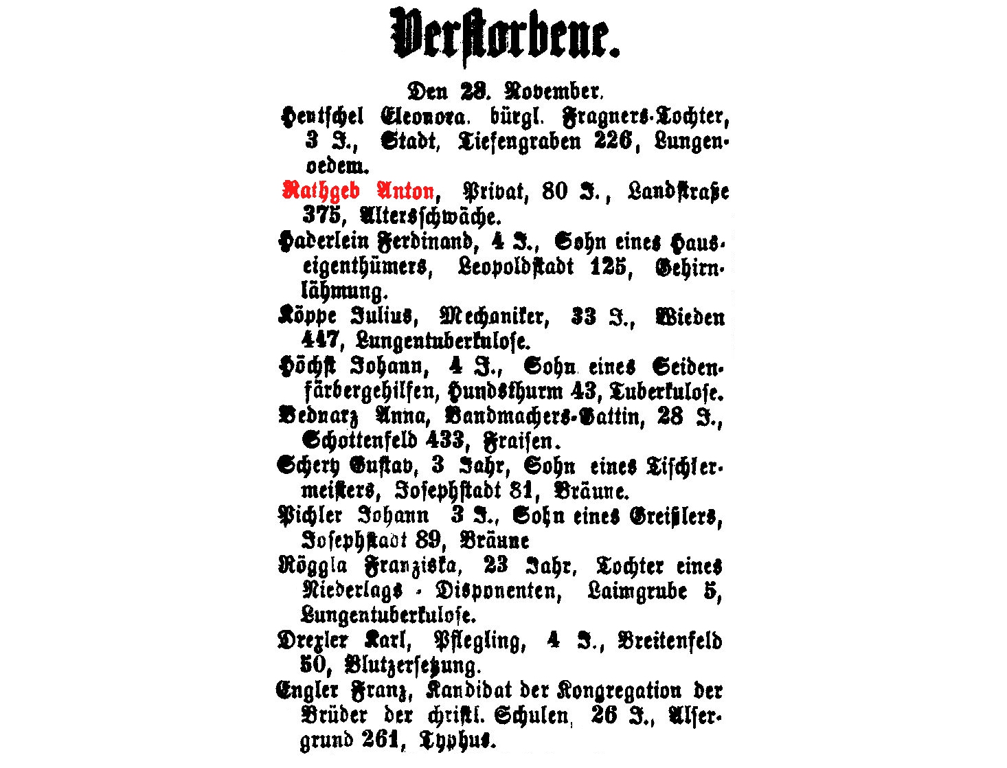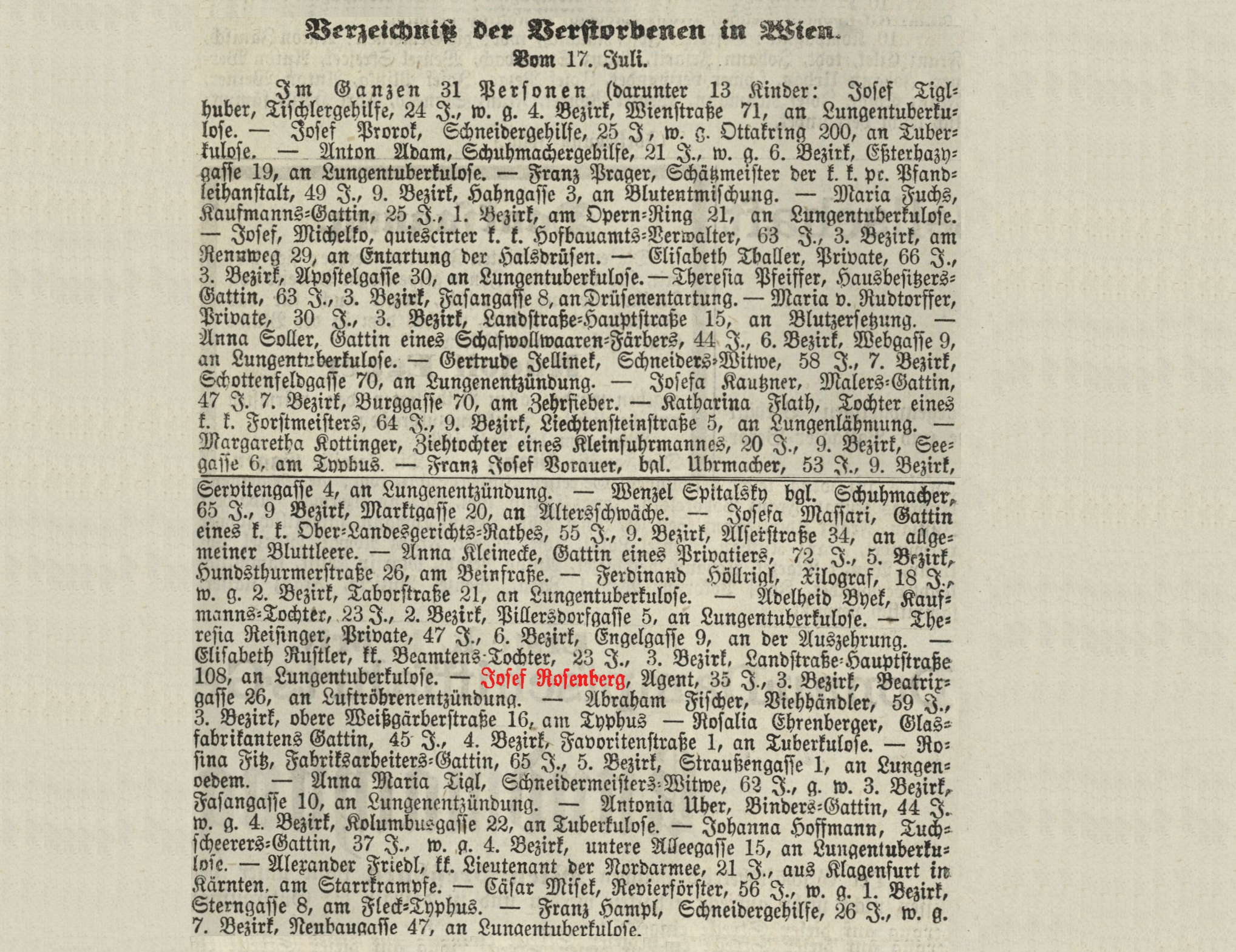 Agent, † 14.7.1866, 35 Jahre, 3. Bezirk, Beatrixgasse 26, an Luftröhrenentzündung.