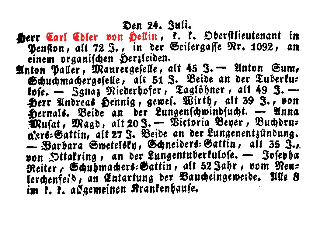 k. k. Oberstlieutenant in Pension, † 24.07.1852, alt 72 J., in der Seilergasse Nr. 1092, an einem organischen Herzleiden.