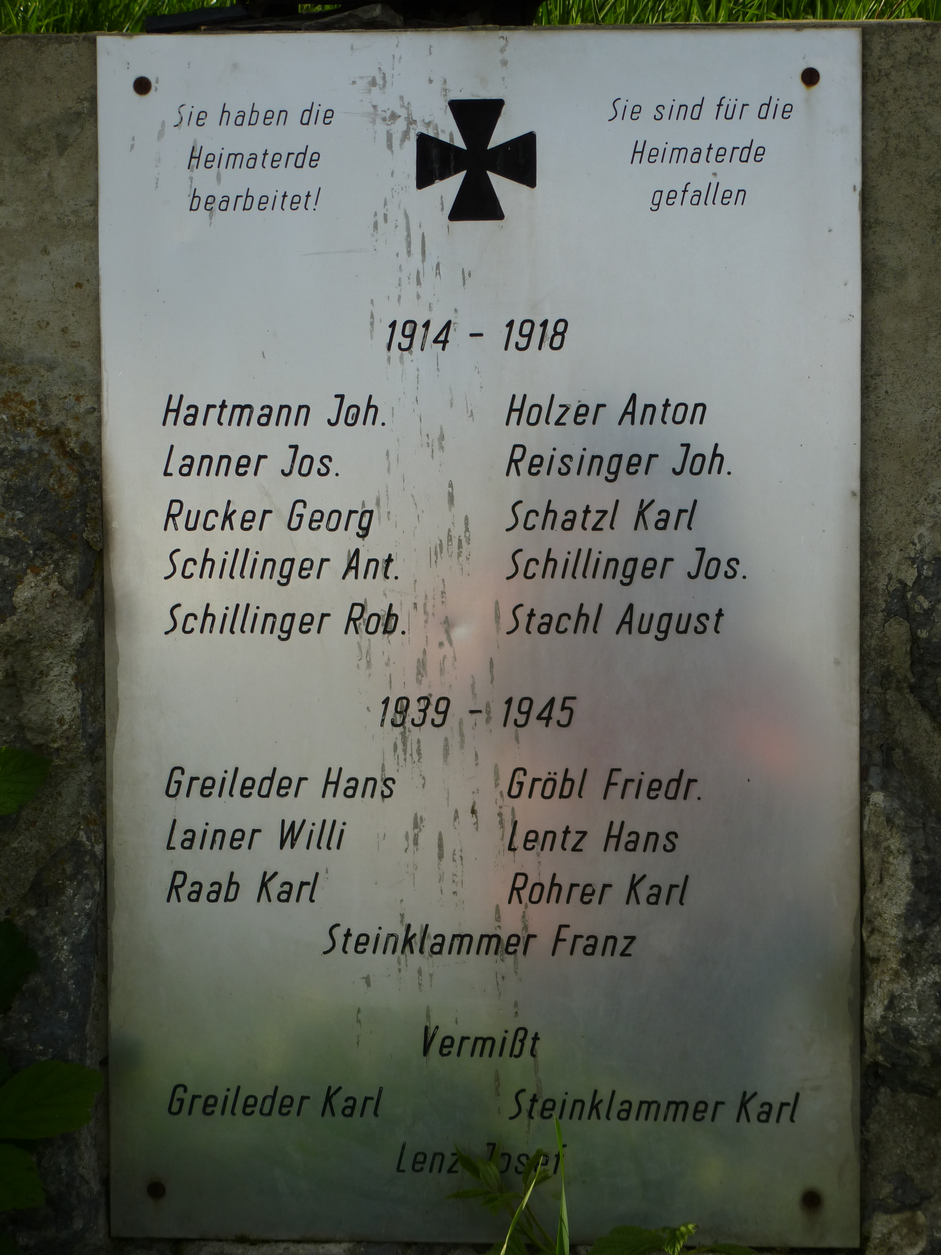 Die Namen der Gefallenen im 1. Weltkrieg lauten: HARTMANN Joh., HOLZER Anton, LANNER Jos., REISINGER Joh., RUCKER Georg, SCHATZL Karl, SCHILLINGER Ant., SCHILLINGER Jos., SCHILLINGER Rob. und STACHL August.