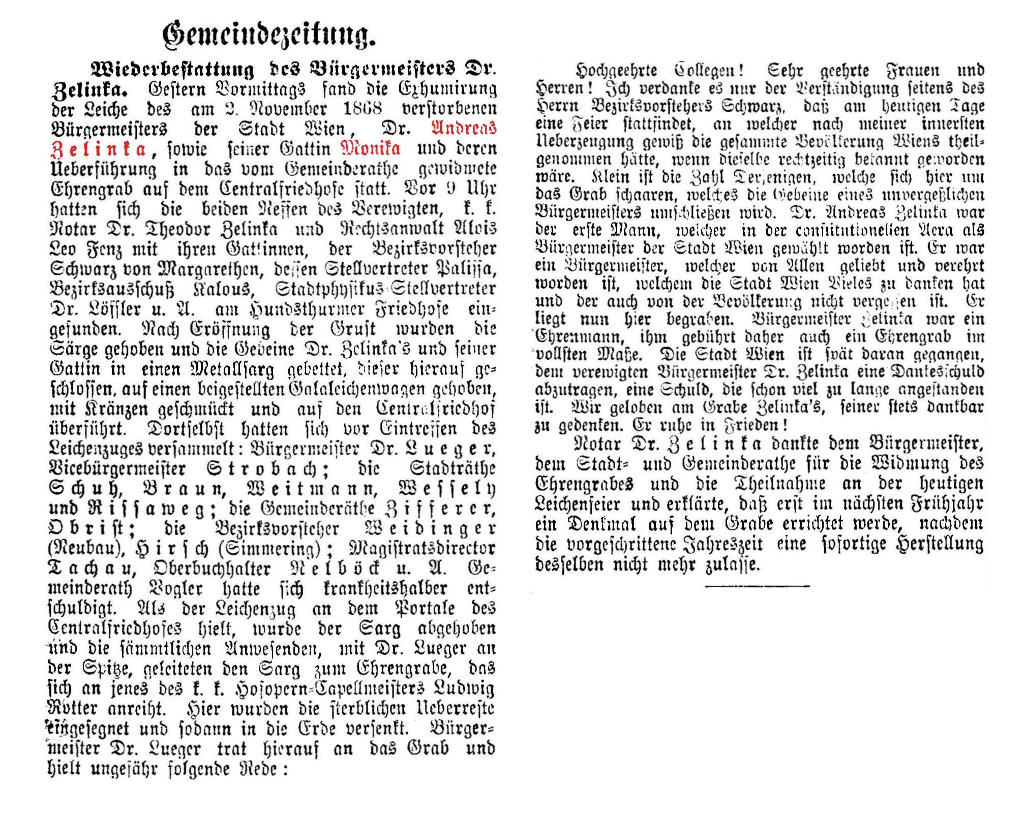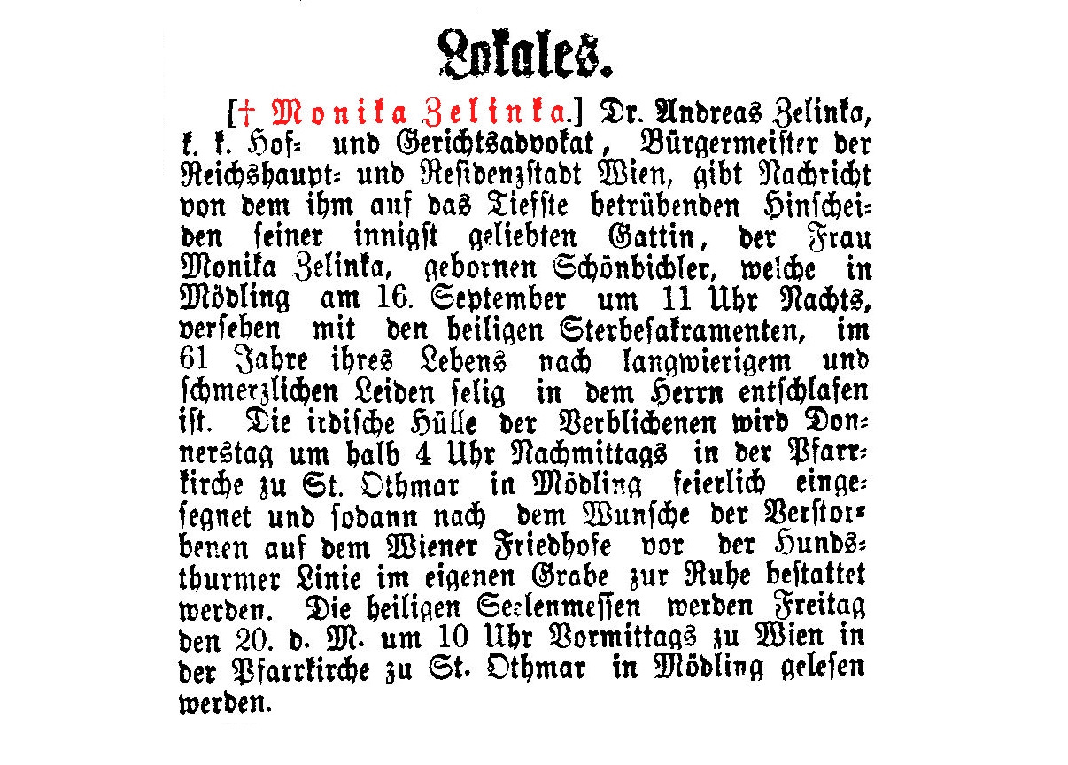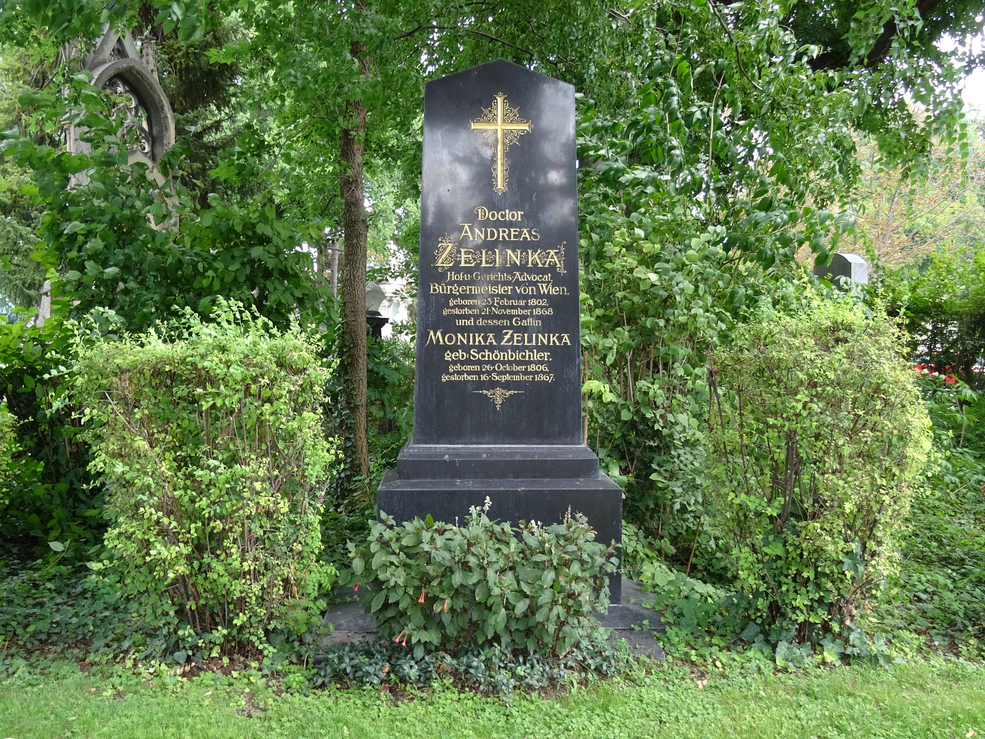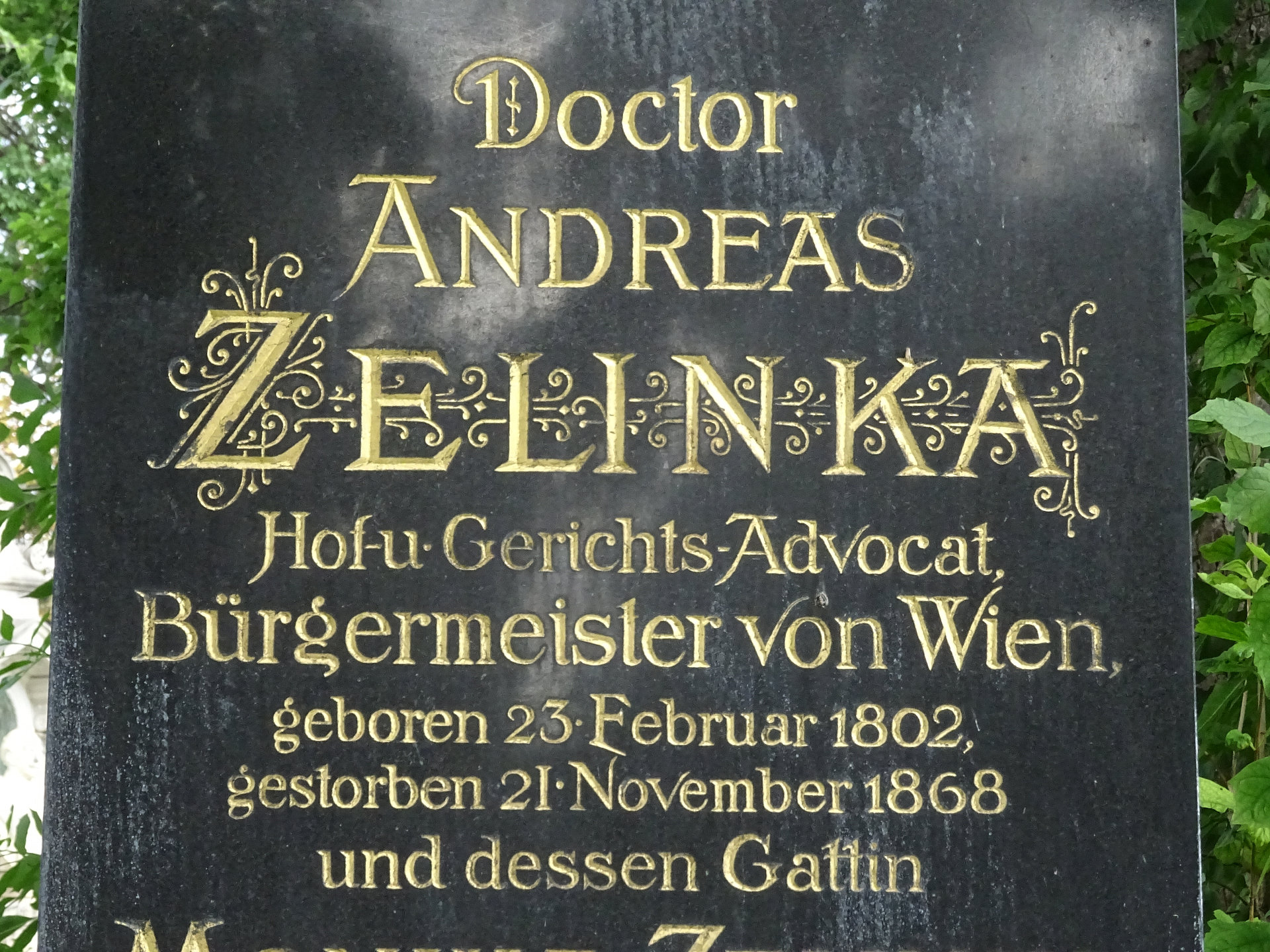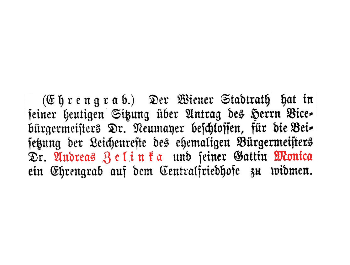 Andreas Zelinka, Hof- und Gerichts-Advocat, * 23. Februar 1802 in Wischau, Mähren, † 21. November 1868 in Wien, Bestattungsdatum: 21.10.1897, war von 1861 bis 1868 Bürgermeister von Wien.