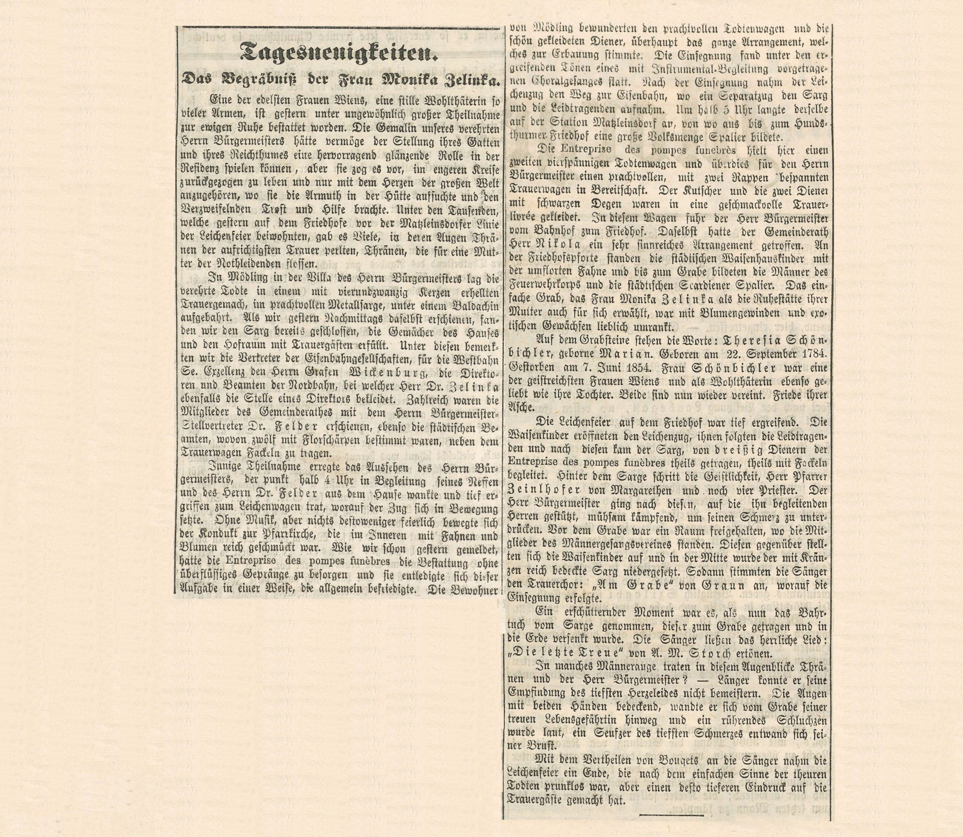 Monika Zelinka, geb. Schönbichler, * 26.10.1806, † 16.09.1867, Bestattungsdatum: 21.10.1897