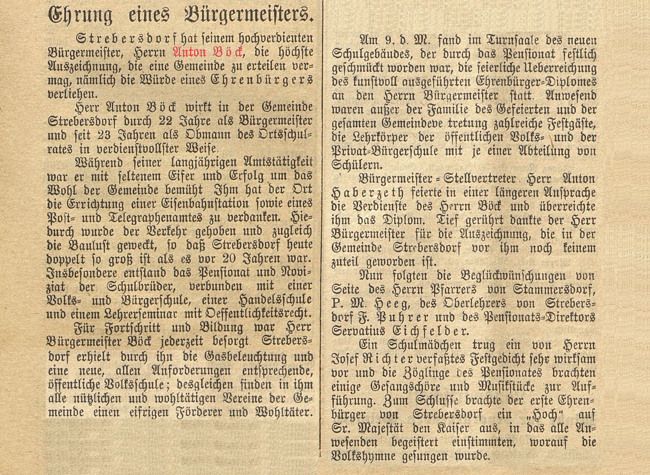 Bürgermeister, Herrn Anton Böck, die höchste