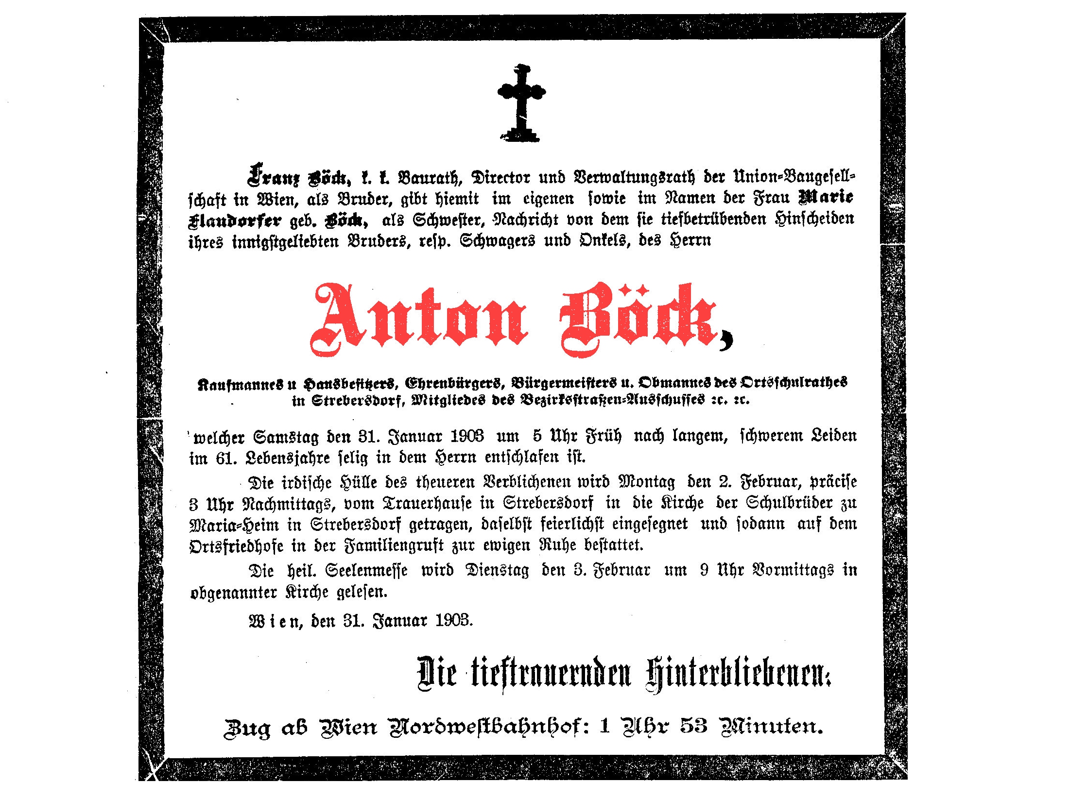 Flandorfer geb. Böck, als Schwester, Nachricht von dem sie tiefbetrübenden Hinscheiden