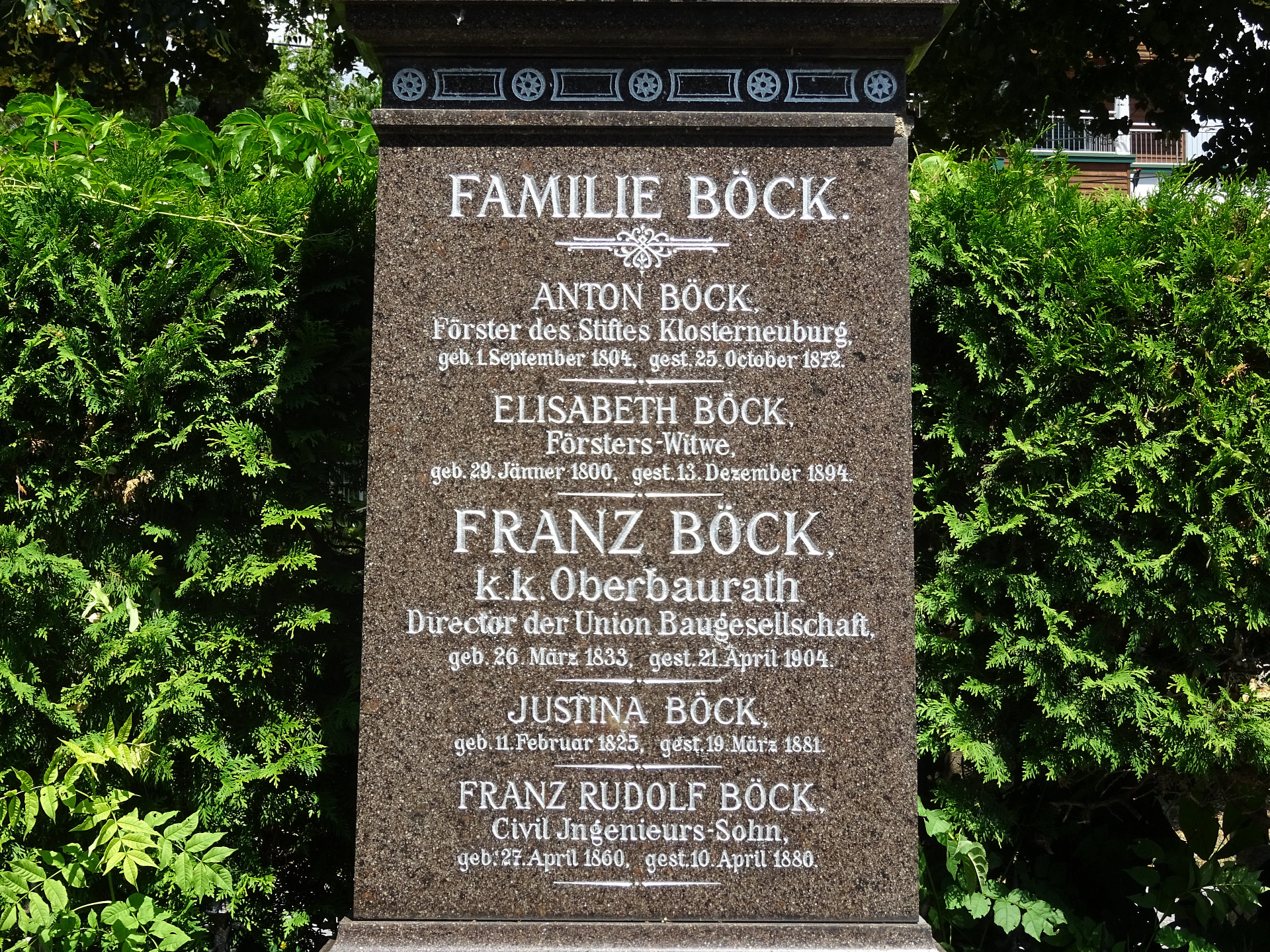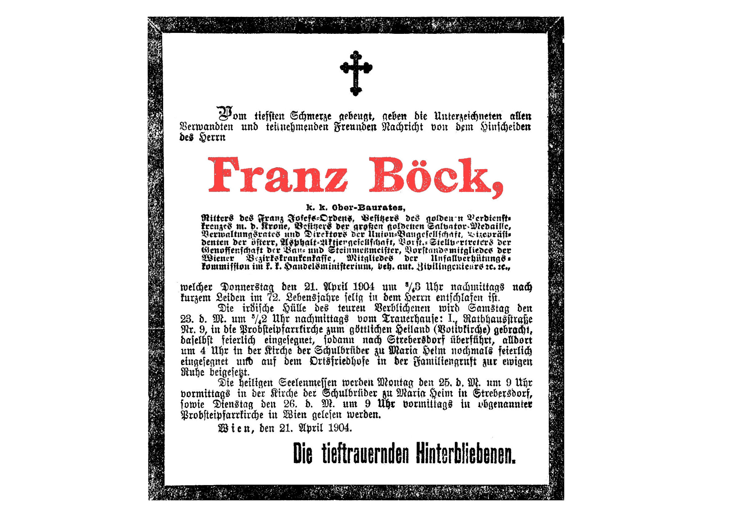 Franz Böck, k.k. Oberbaurat, Direktor der Union Baugesellschaft, * 26.03.1833, † 21.04.1904, Bestattungsdatum: 23.04.1904