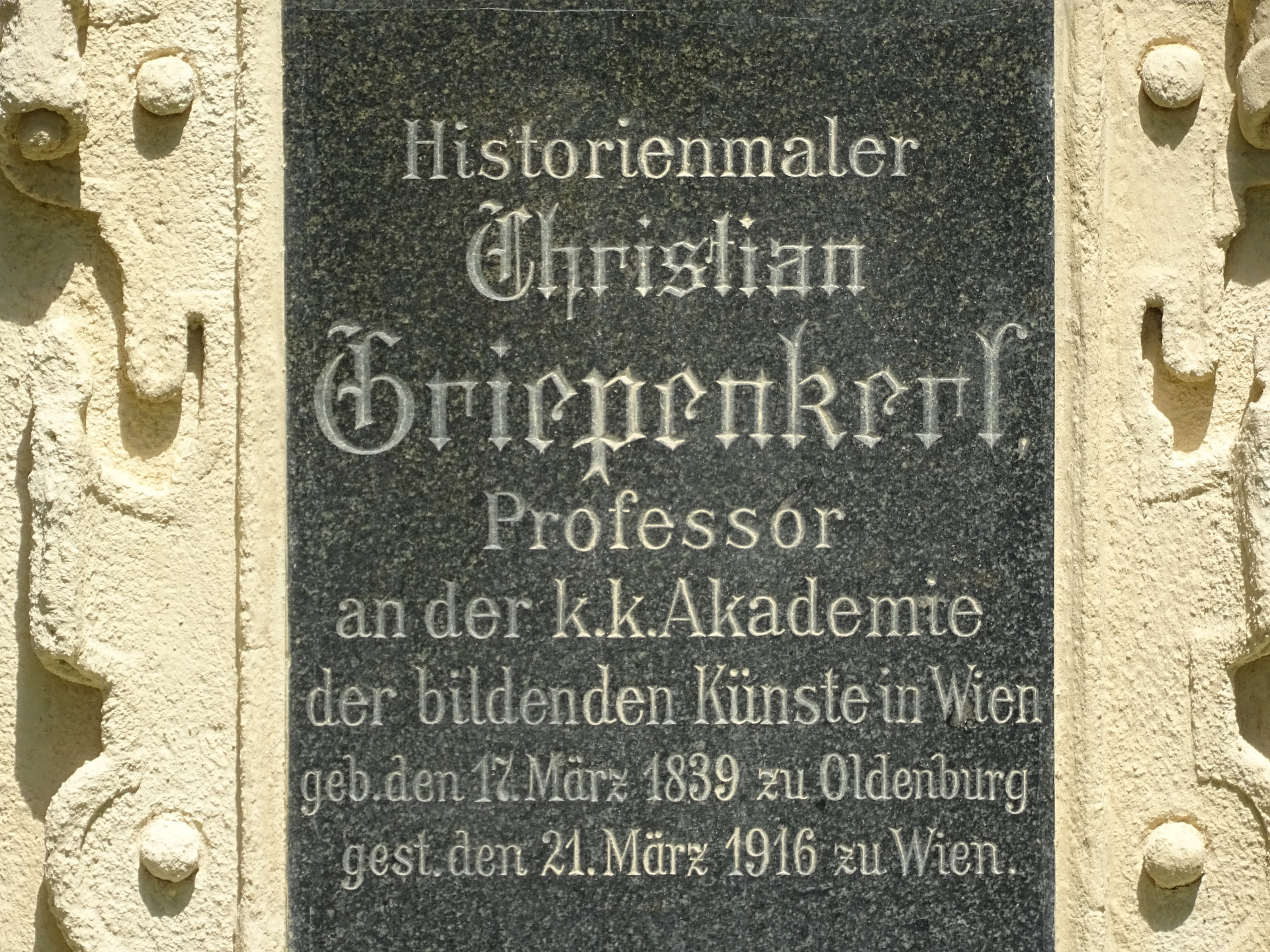 Leben: Christian Griepenkerl wurde 1839 in Oldenburg geboren, stammte aus einer alten Oldenburger Familie und erhielt die ersten künstlerischen Anstöße durch den Maler Ernst Willers (1803–1880). Aufgrund seines Rates begab sich Griepenkerl Ende 1855 nach Wien in die Schule Carl Rahls, der seit 1851 eine private Meisterschule für Monumentalmalerei leitete. Rahl beteiligte mehrere seiner Schüler an der Vorbereitung und Ausführung seiner Bilder und prägte dadurch deren persönliche künstlerische Entwicklung. So arbeitete Griepenkerl in Wien an den Fresken in der Treppenhalle des k.k. Hofwaffenmuseums (heute: