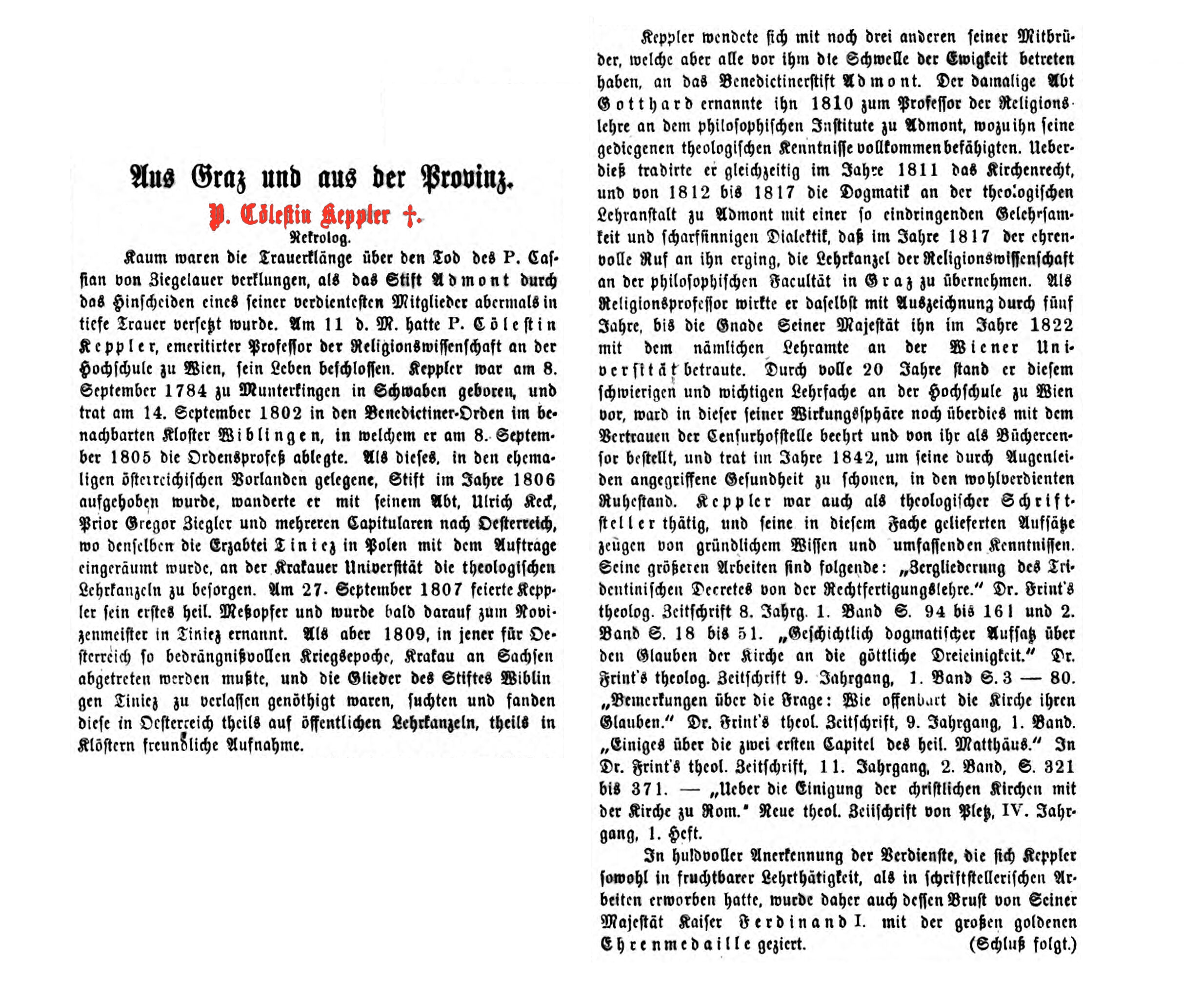 Leben: Cölestin Keppler wurde am 8. September 1784 in Munderkingen im Alb-Donau-Kreis in Baden-Württemberg geboren