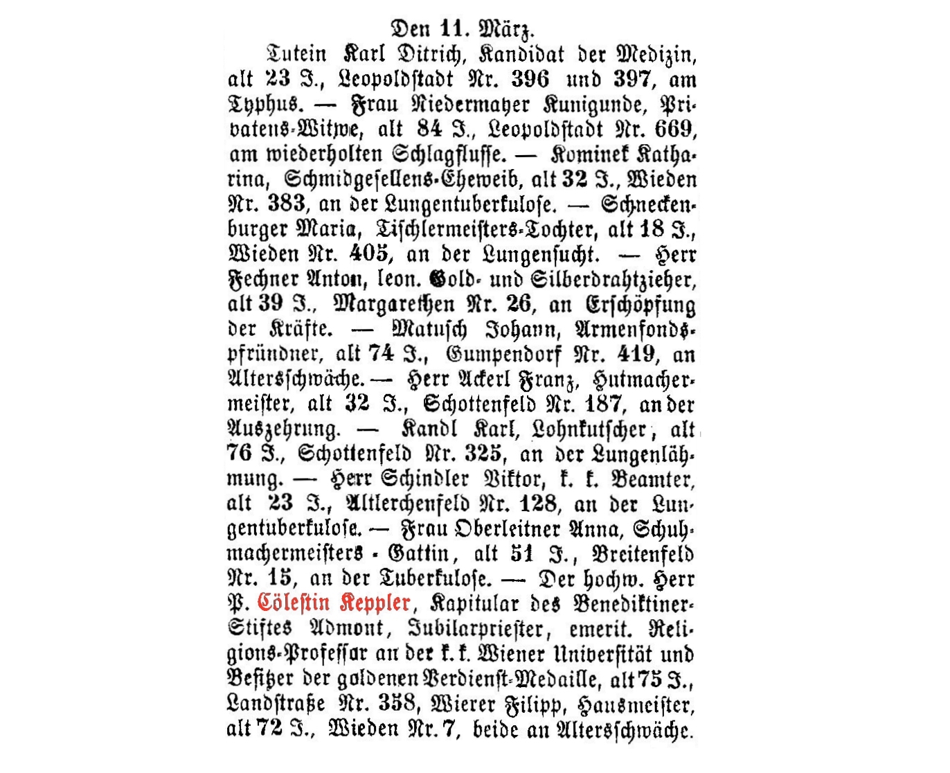 Cölestin Keppler verstarb am 11. März 1858 in Wien an Altersschwäche.