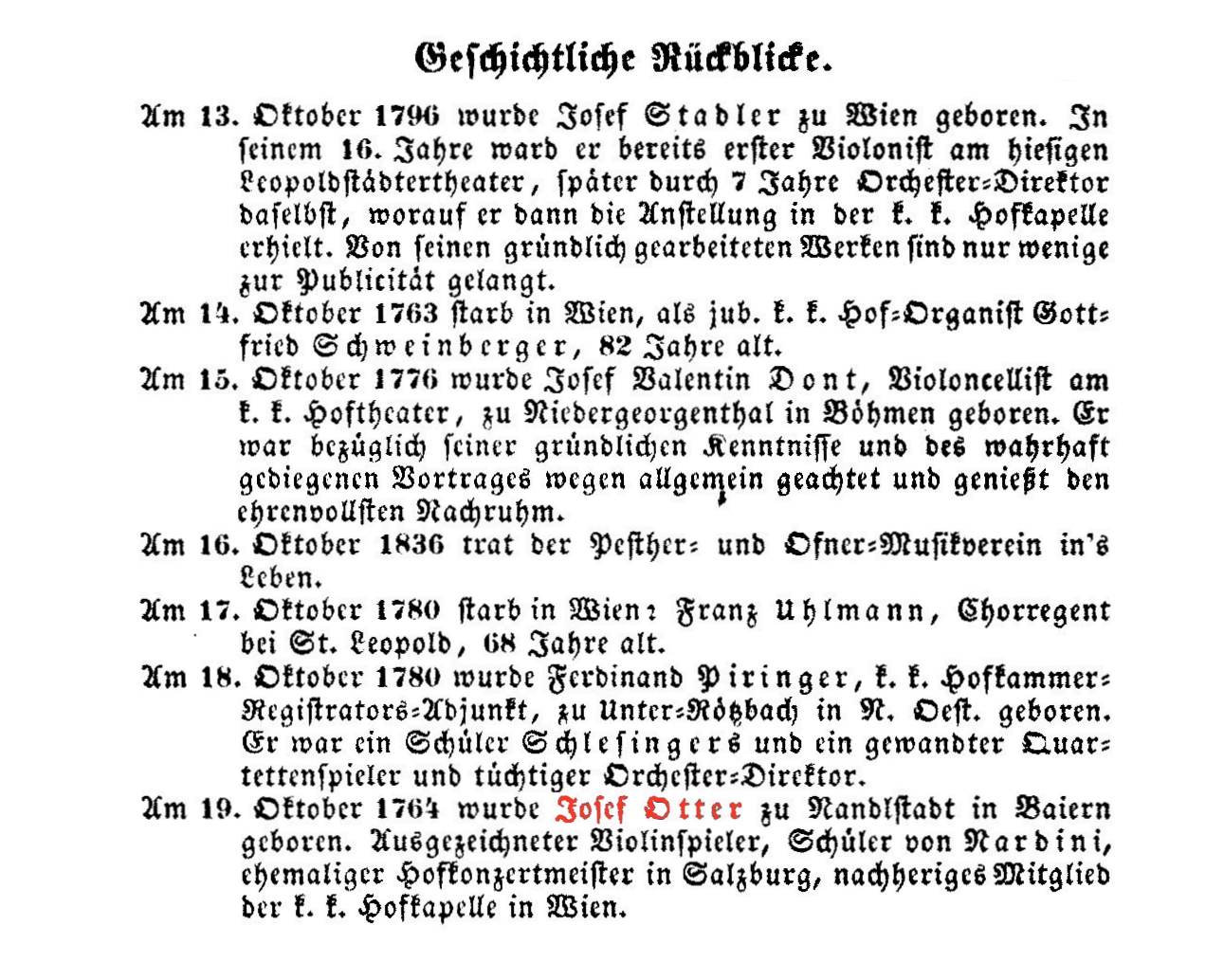 Franz Joseph Otter, Konzertmeister, Geiger und Direktor der Hofkapelle, * 30.05.1760 (oder 19.10.1764 laut Neue Wiener Musik-Zeitung) in Nandlstadt, Bayern, † 01.09.1836 in Wien,