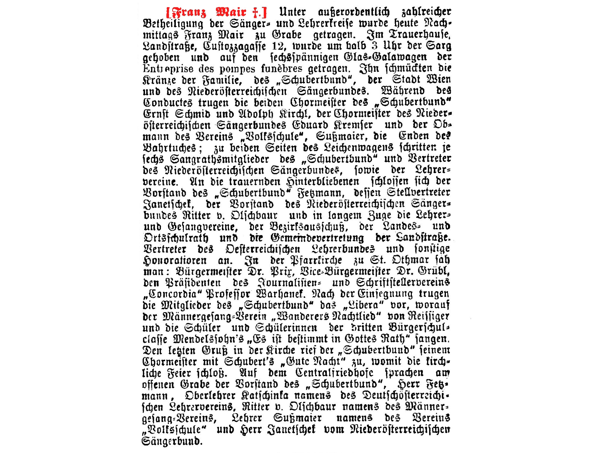 Das Leichenbegängniß Franz Mair's erfolgt