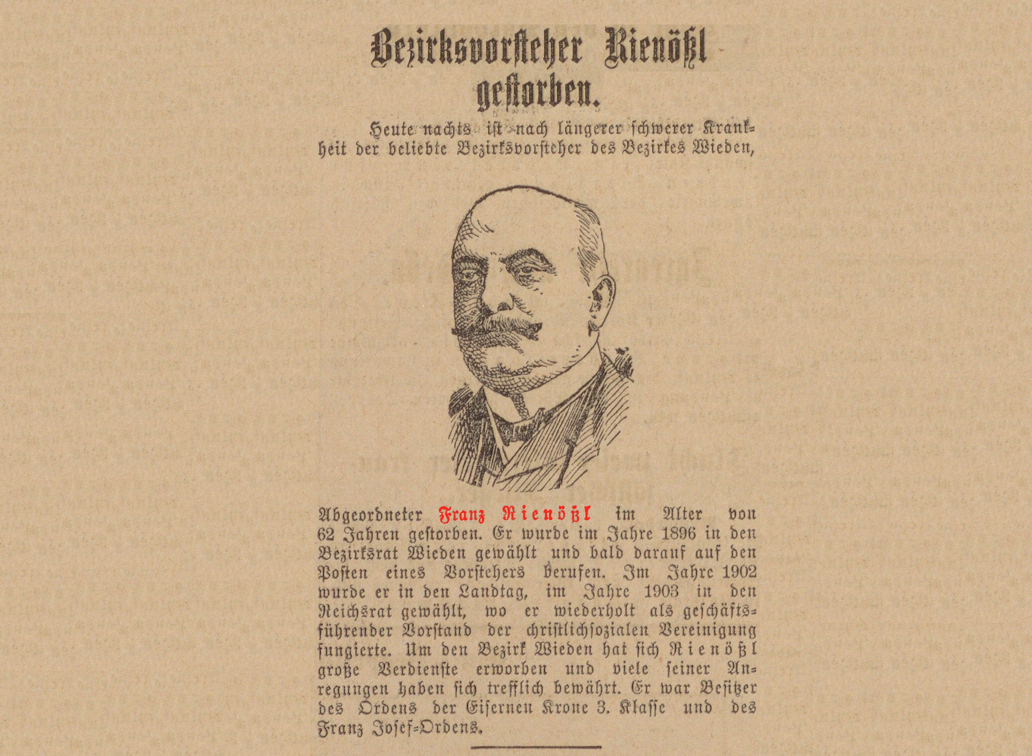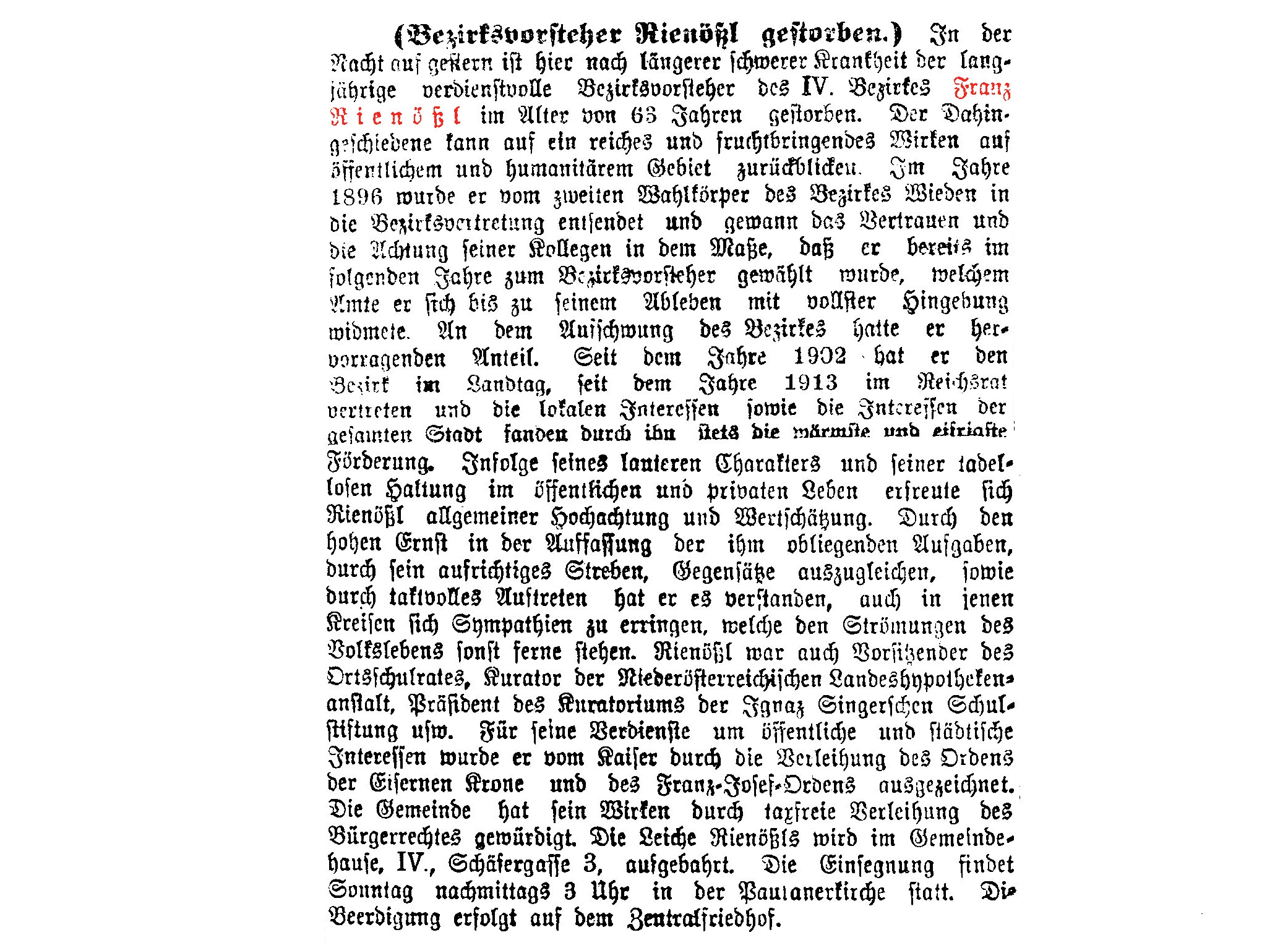 (Bezirksvorsteher Rienößl gestorben.) In der