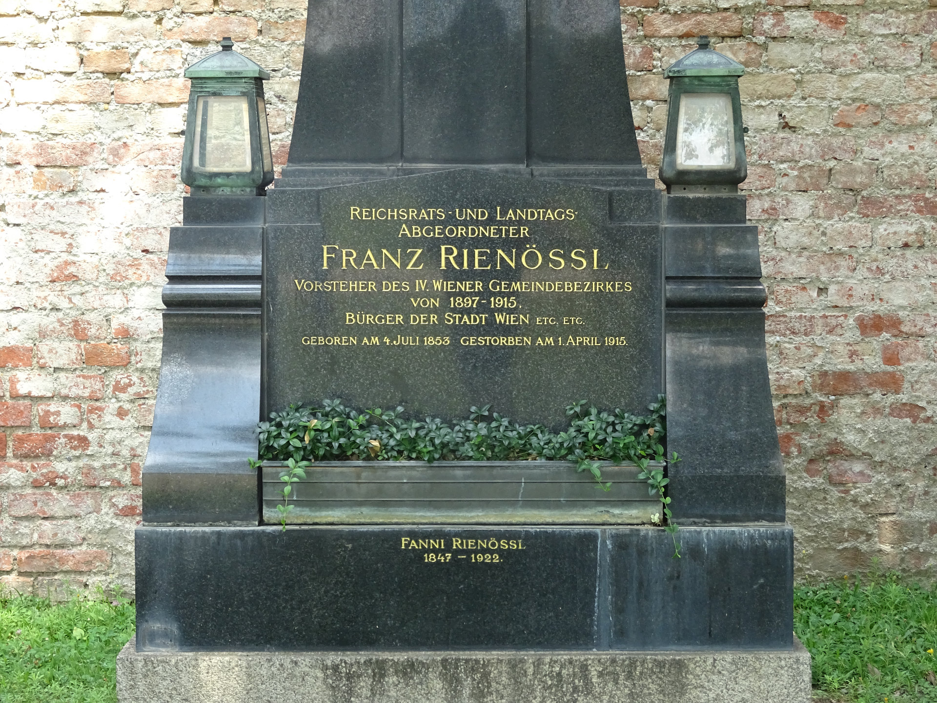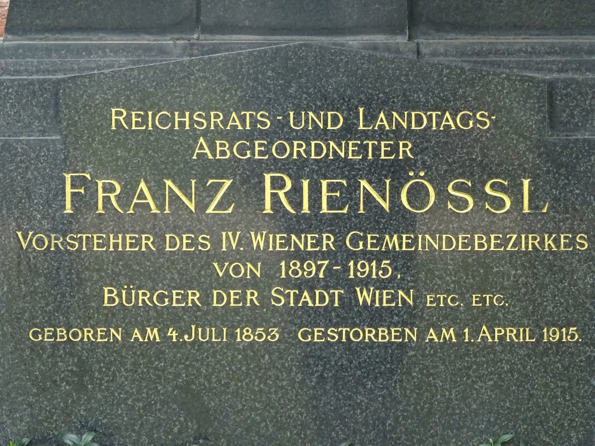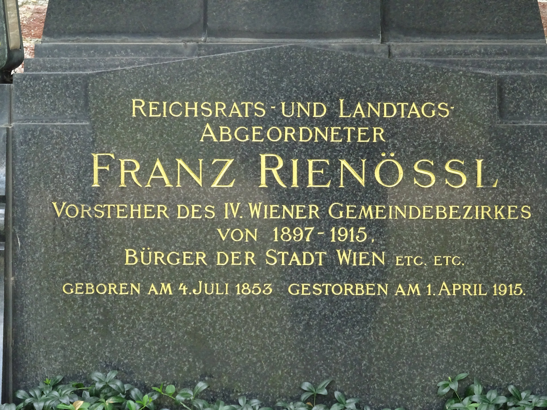 Franz Rienössl (auch Rienößl), * 04.07.1853 in Wien, † 01.04.1915 in Wien, Bestattungsdatum: 04.04.1915, Offizier, Hausbesitzer, Politiker.