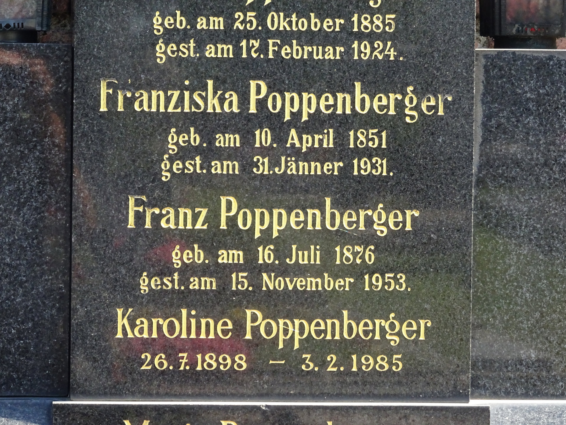 Franziska Poppenberger, geb. Menzel, * 10.04.1851, † 31.01.1931, Bestattungsdatum: 04.02.1931, zuletzt wohnhaft: 23., Steinhofstraße 1