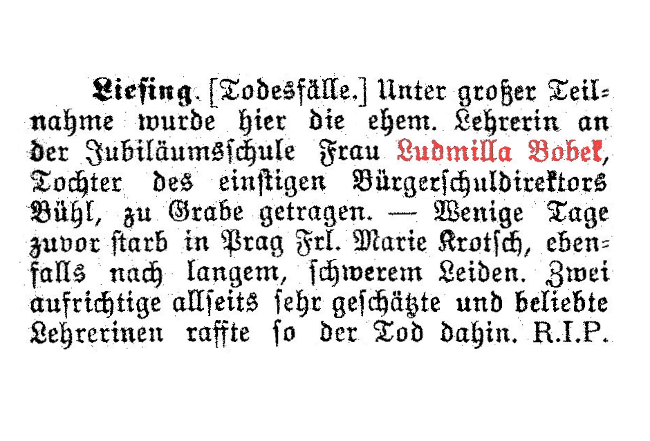 Ludmilla Bobek, geb. Bühl (Tochter), Lehrerin an der Jubiläumsschule, † xx.07.1919, Bestattungsdatum: 06.07.1919