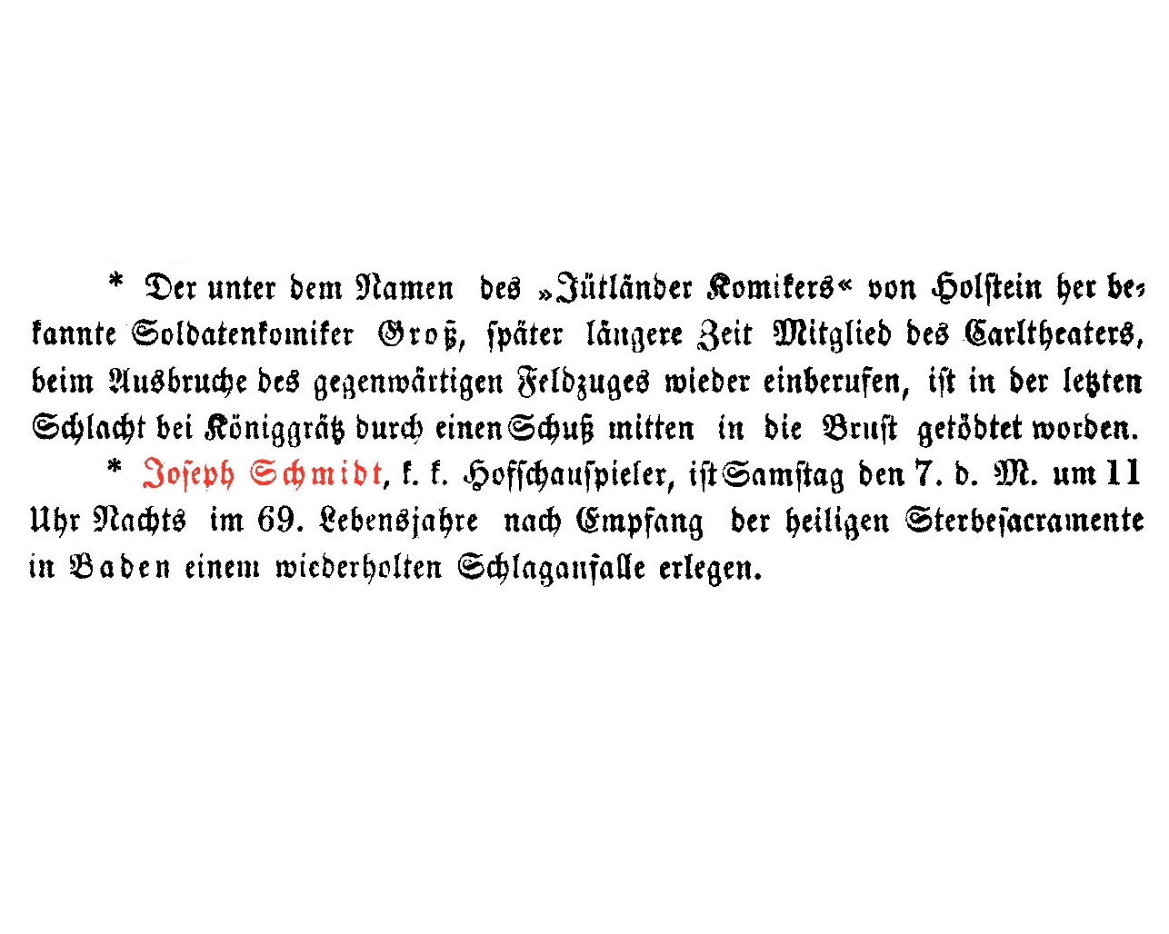 Blätter für Musik, Theater und Kunst vom 13.7.1866, Seite 4: Joseph Schmidt, k. k. Hofschauspieler, ist Samstag den 7. d. M. um 11 Uhr Nachts im 69. Lebensjahre nach Empfang der heiligen Sterbesacramente in Baden einem wiederholten Schlaganfalle erlegen.