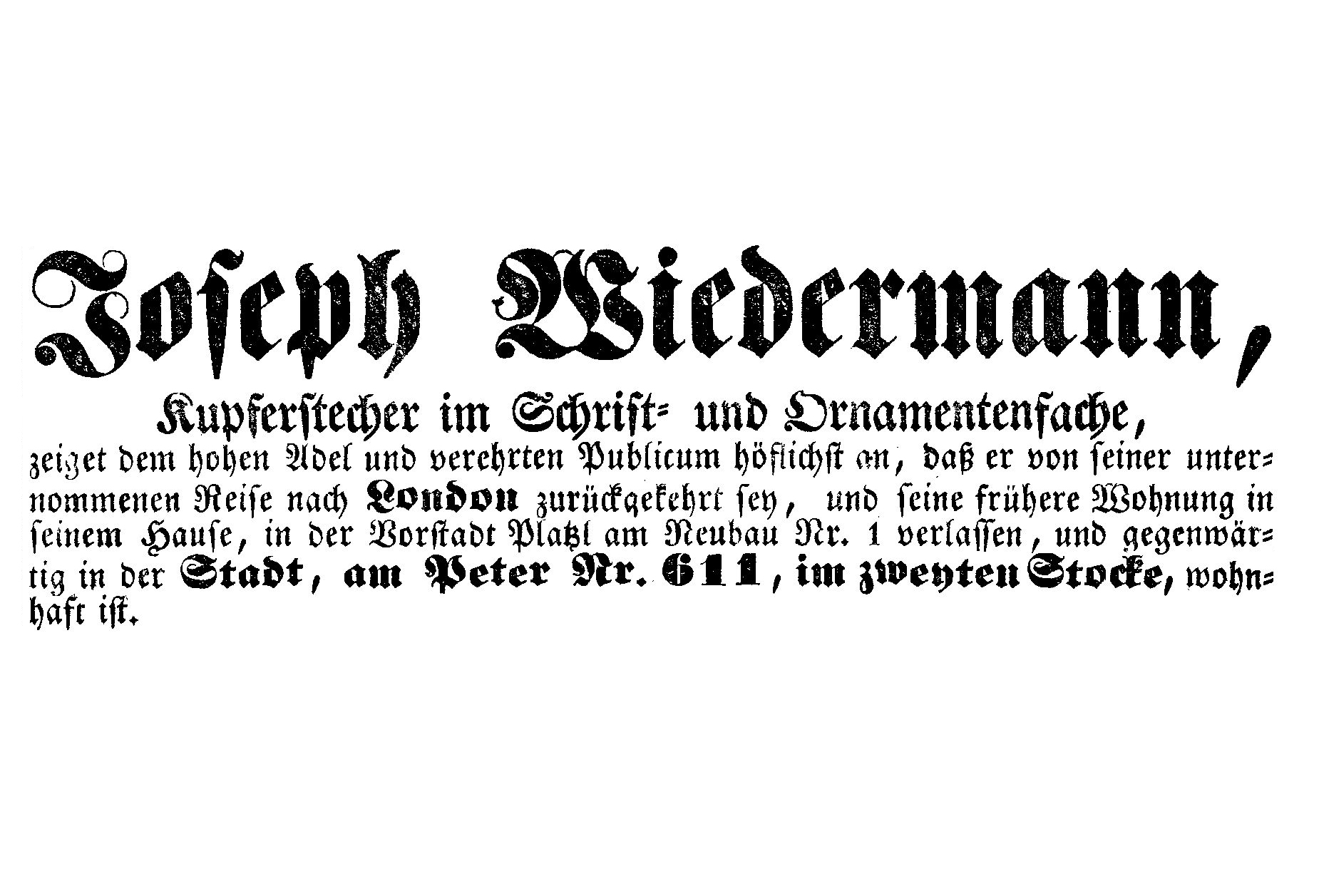 in der Stadt, am Peter Nr. 611, im zweyten Stocke, wohnhaft ist.