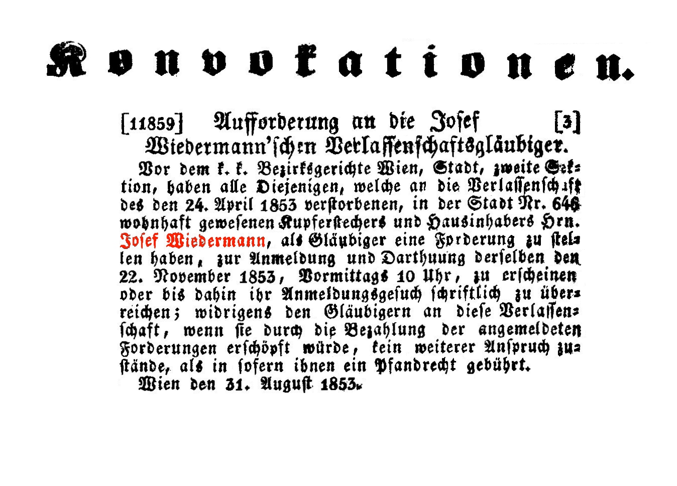Wiener Zeitung vom 8.11.1853, Seite 23.