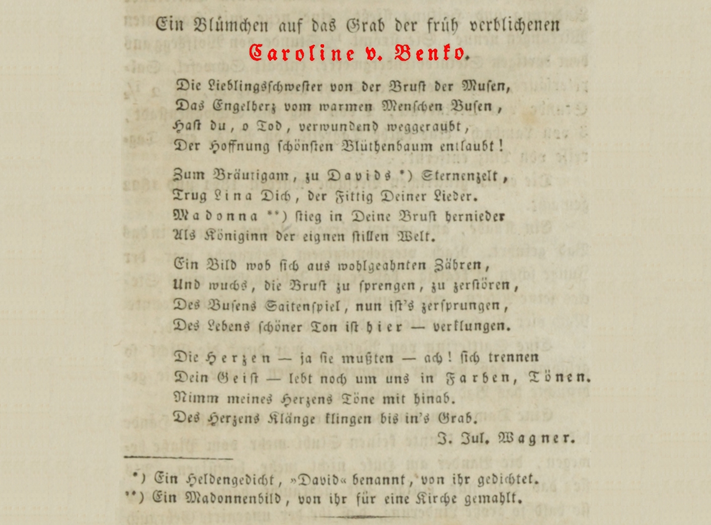 Ein Blümchen auf das Grab der früh verblichenen Caroline v. Benko.