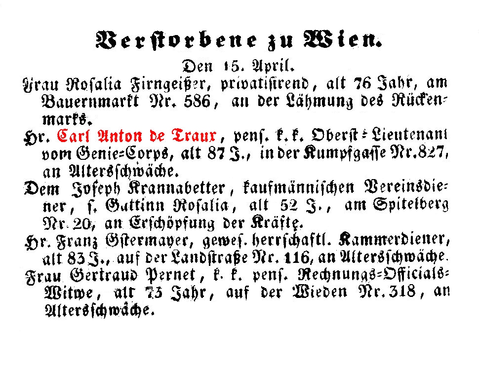 Theresia de Traux, k.k. Feldmarschall-Lieutenant in Pension, * 1x.03.1780, vermählt 21.11.18xx, † 30.04.1849, zuletzt wohnhaft: Köllnerhofgasse Nr. 739.