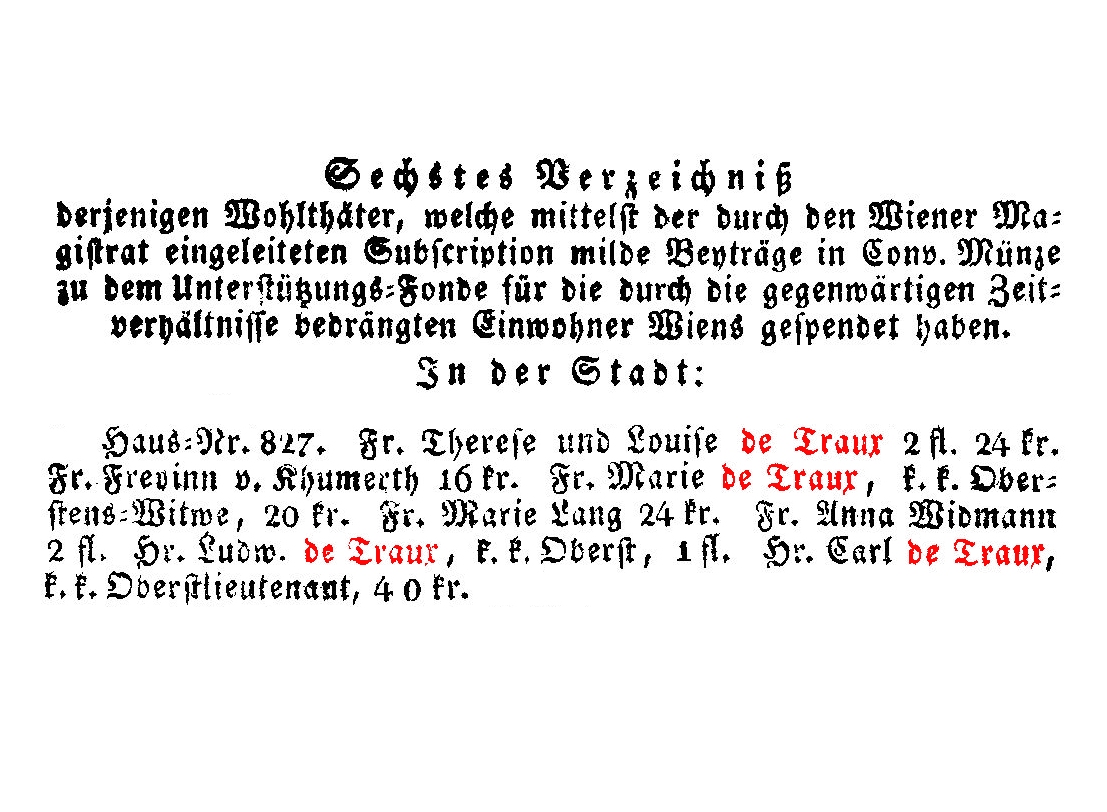 k. k. Oberst [zu diesem Zeitpunkt war Ludwig de Traux Oberst], 1 fl. Hr. Carl de Traux,