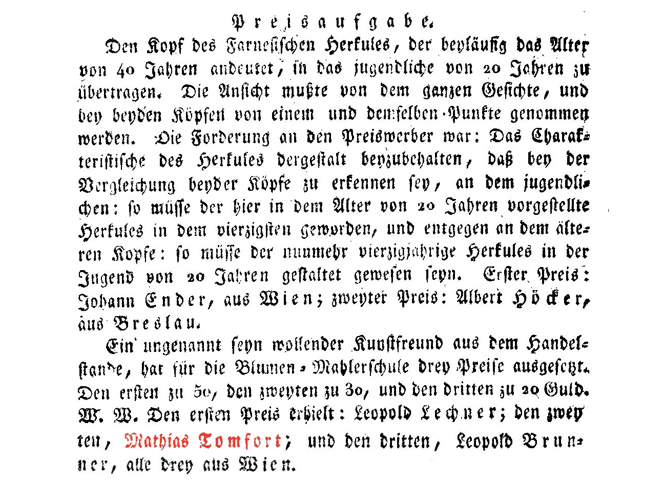 Wiener Zeitung vom 20.2.1813, Seite 1: Ein ungenannt seyn wollender Kunstfreund aus dem Handelstande, hat für die Blumen-Mahlerschule drey Preise ausgesetzt. Den ersten zu 50, den zweyten zu 30, und den dritten zu 20 Guld. W. W. Den ersten Preis erhielt: Leopold Lechner; den zweyten, Mathias Tomfort; und den dritten Leopold Brunner, alle drey aus Wien.