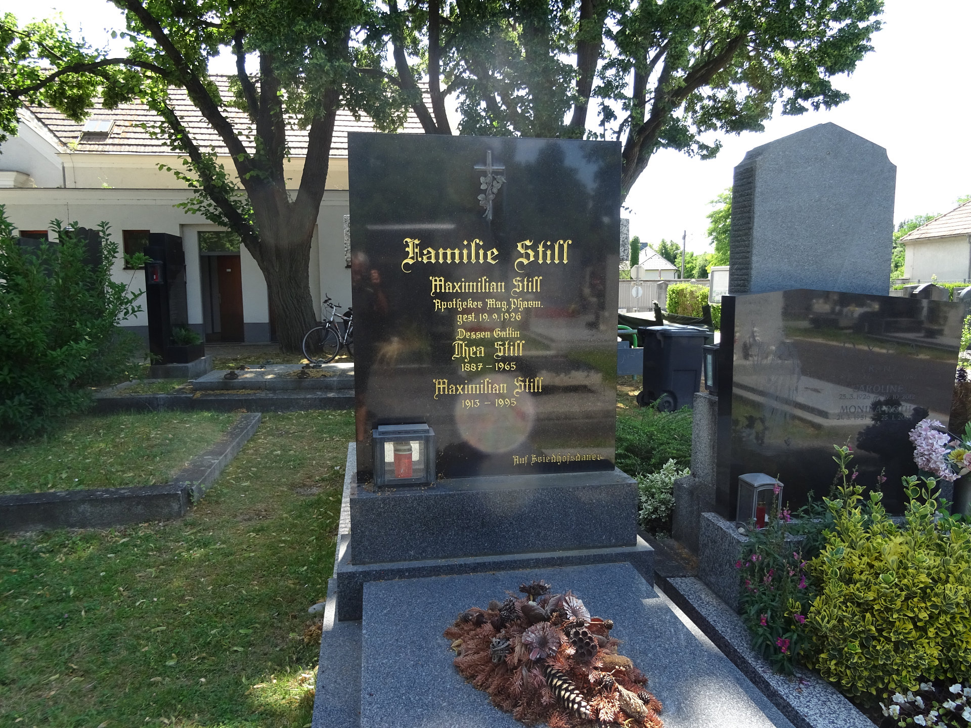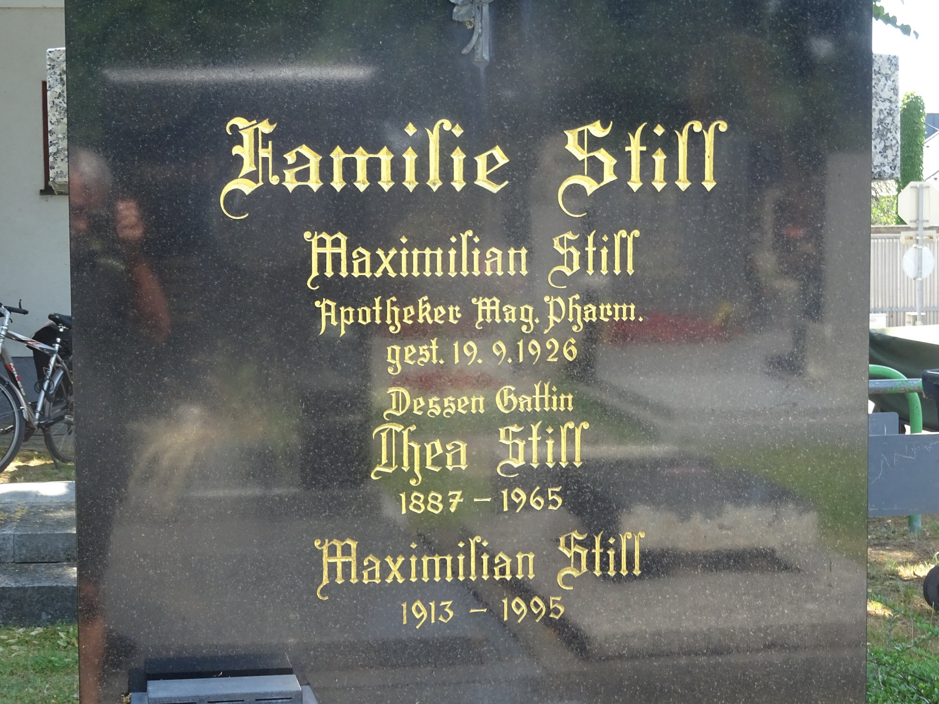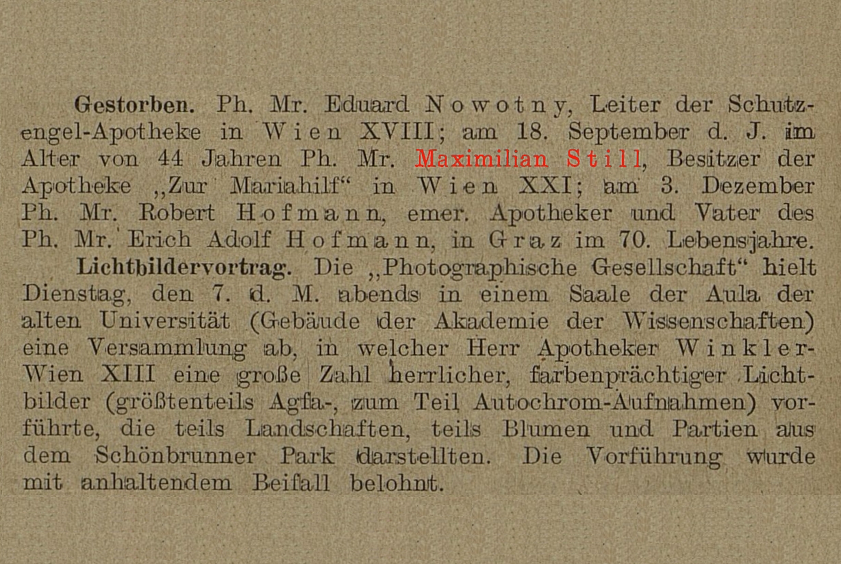 Pharmaceutische Post vom 25.12.1926, Seite 8: Gestorben. ... am 18. September d. J. im Alter von 44 Jahren Ph. Mr. Maximilian Still, Besitzer der Apotheke „Zur Mariahilf“ in Wien XXI; ...