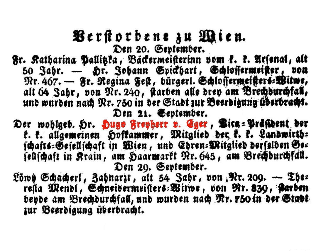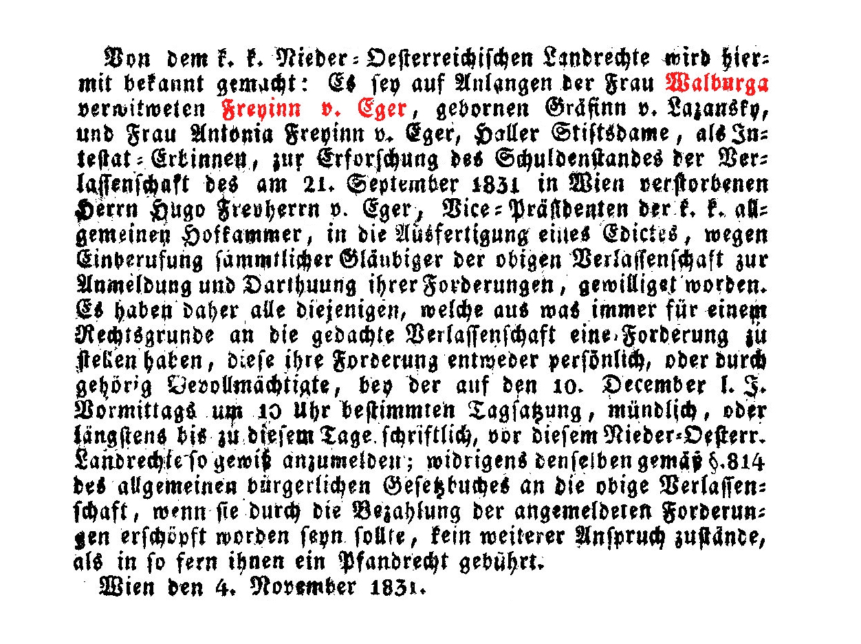 Franzisca, geb. 1. Mai 1775, Witwe seit 21. Sept. 1831, von Hugo Freiherrn von Eger, Vicepräsident der allgemeinen Hofkammer.