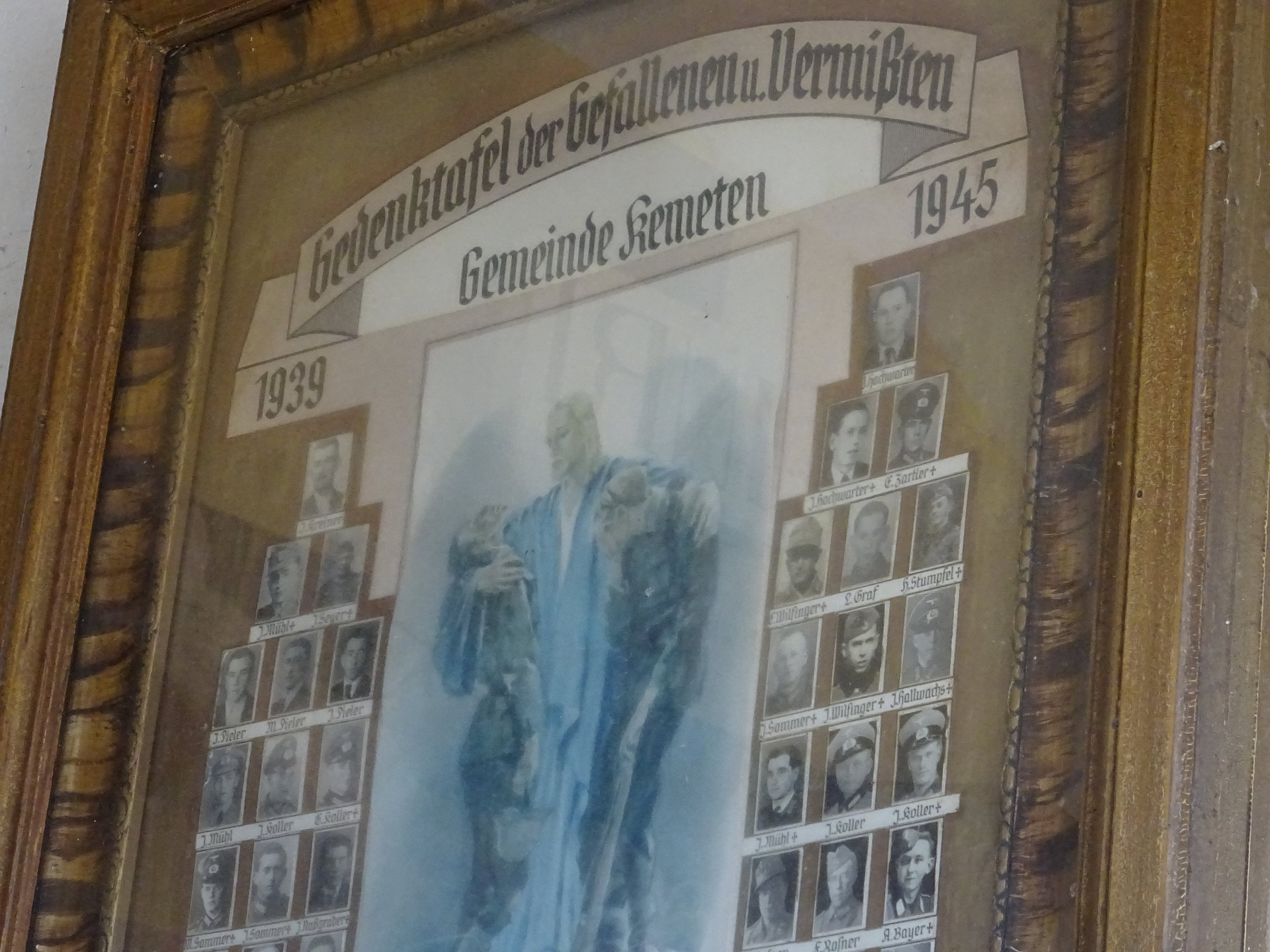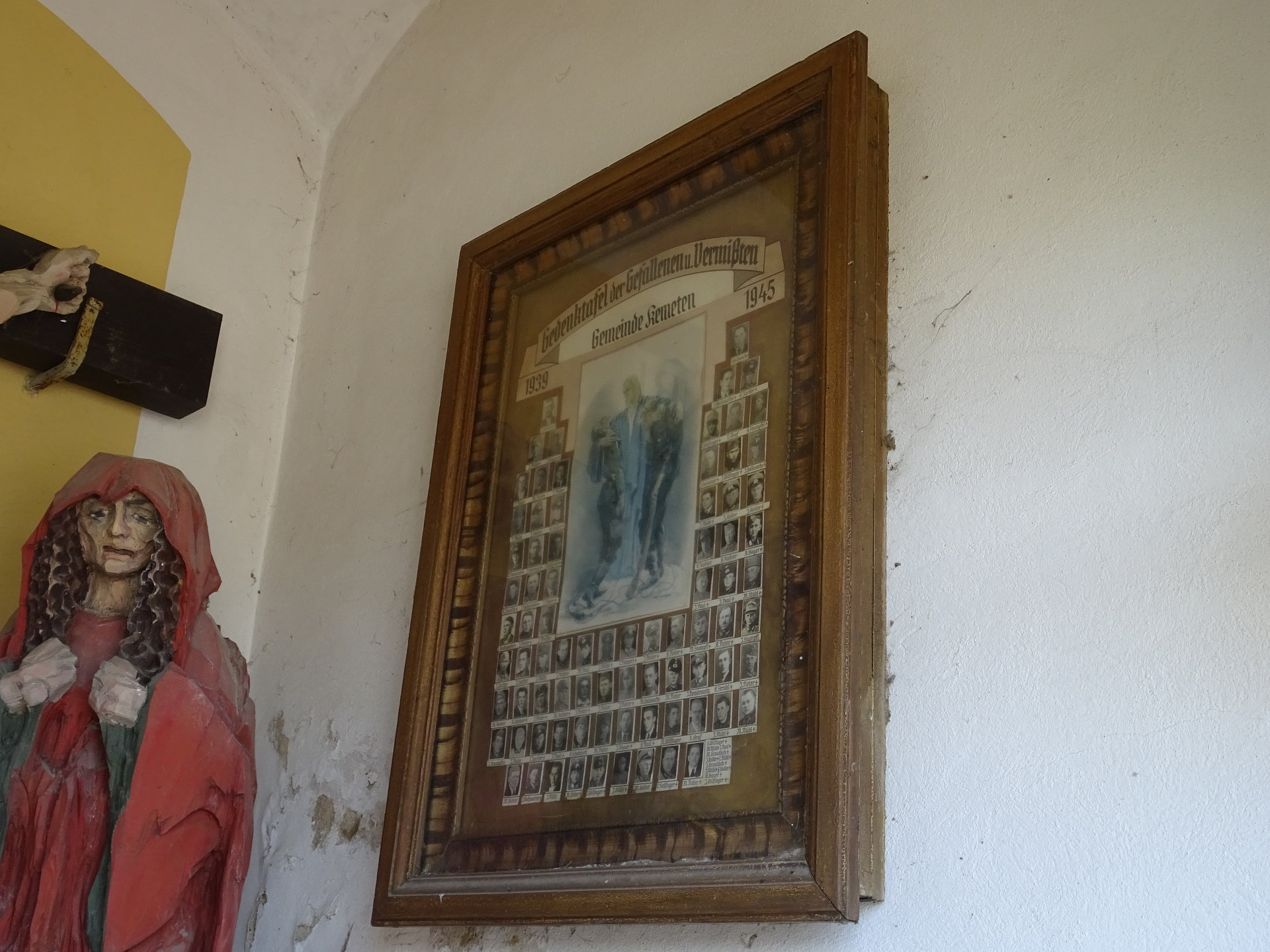 Die Kapelle beinhaltet eine Gedenktafel mit Fotos für die Gefallenen und Vermissten im 2. Weltkrieg.