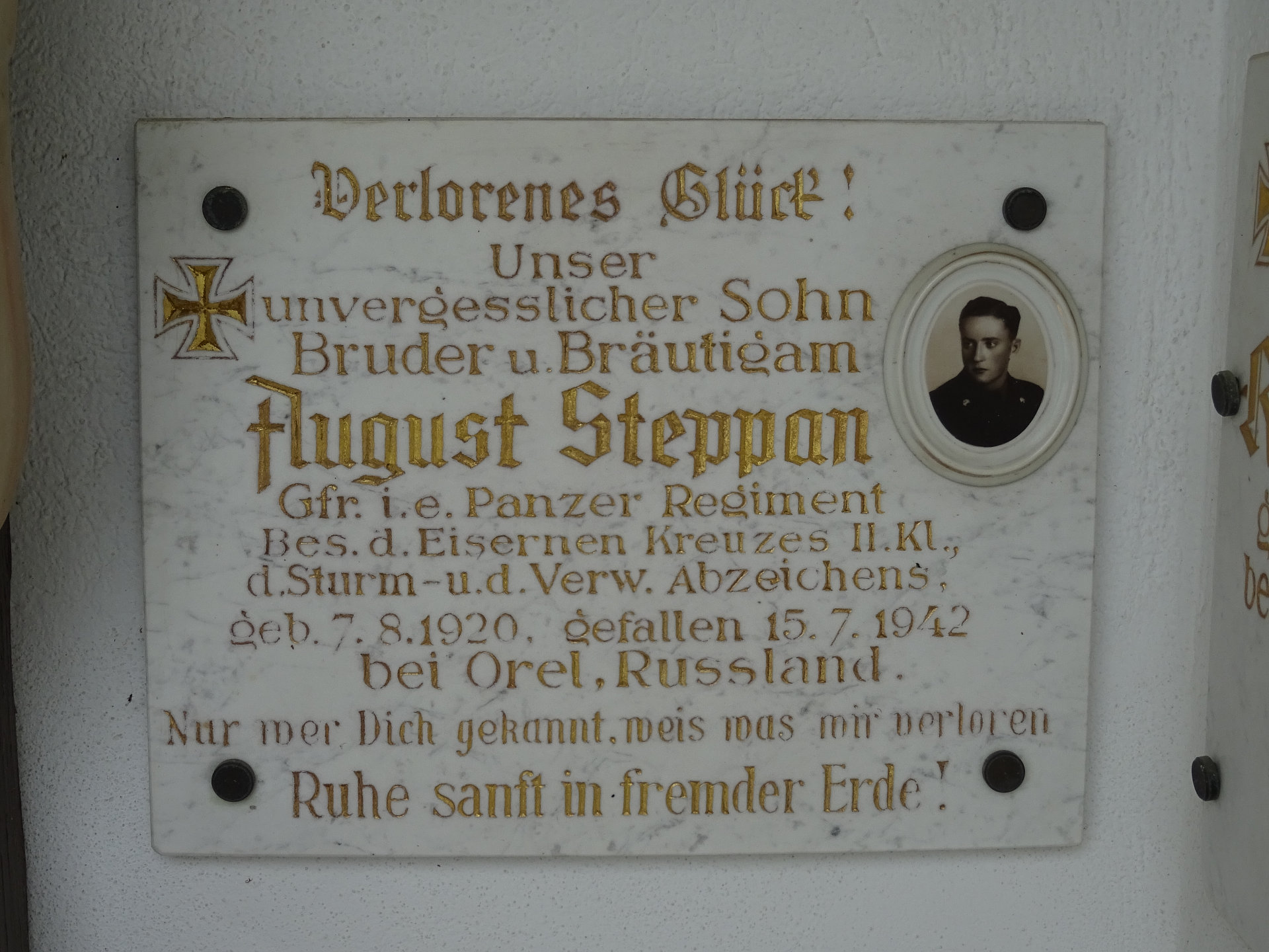 Gfr. STEPPAN August, * 07.08.1920, † 15.07.1942 bei Orel, Russland, Panzer Regiment, Bes. d. EK II. Kl., d. Sturm- u. d. Verw. Abzeichens