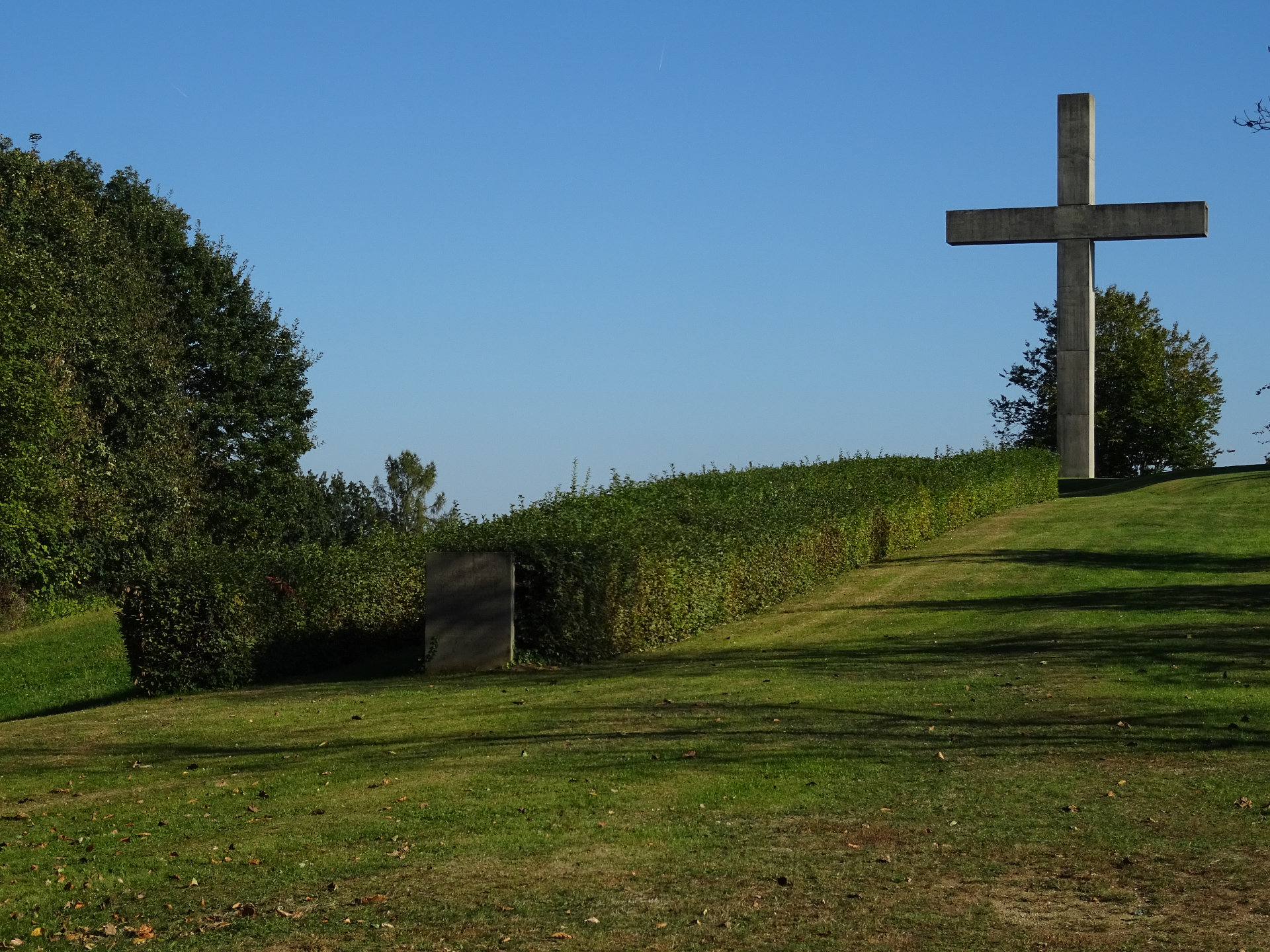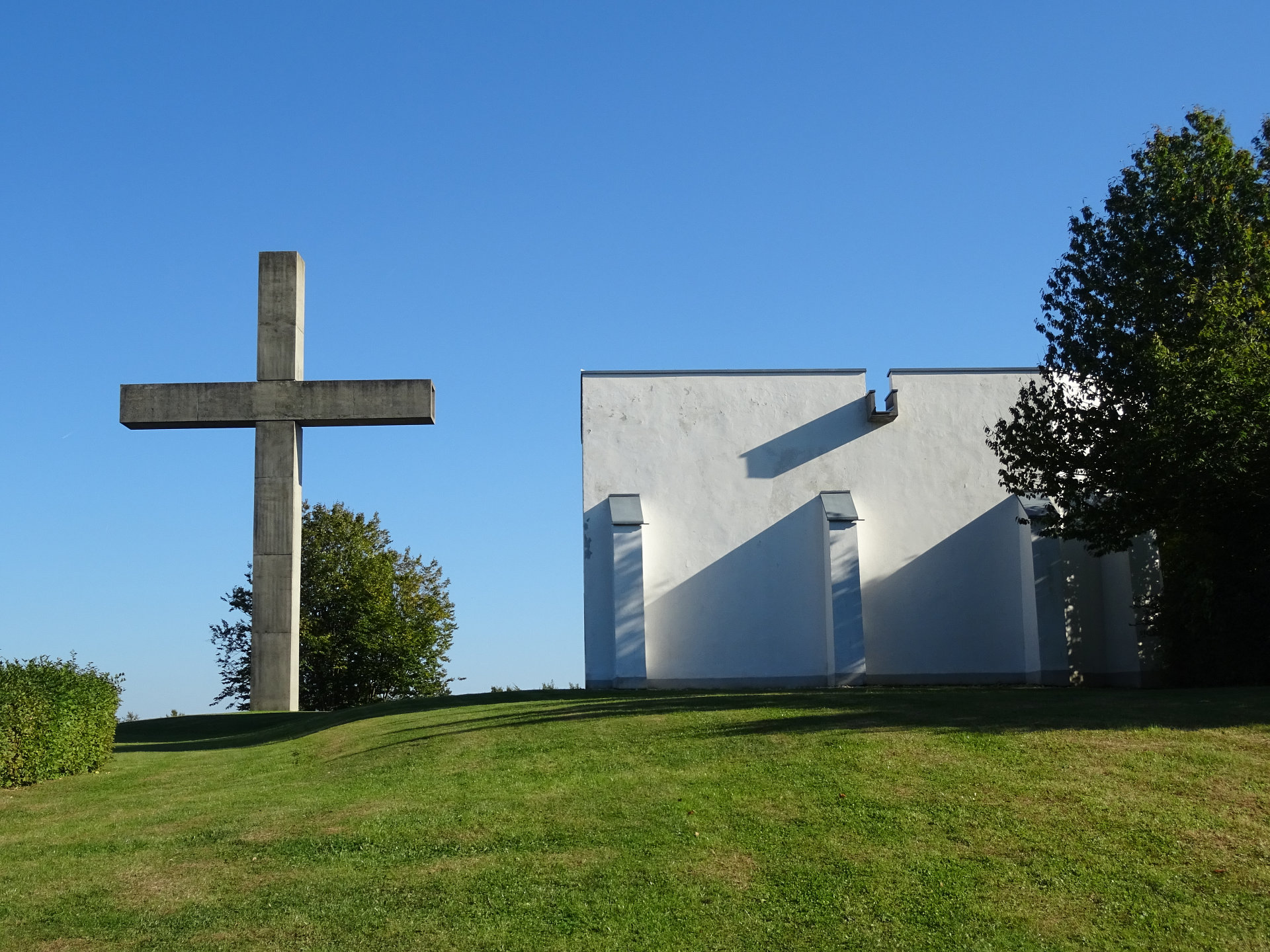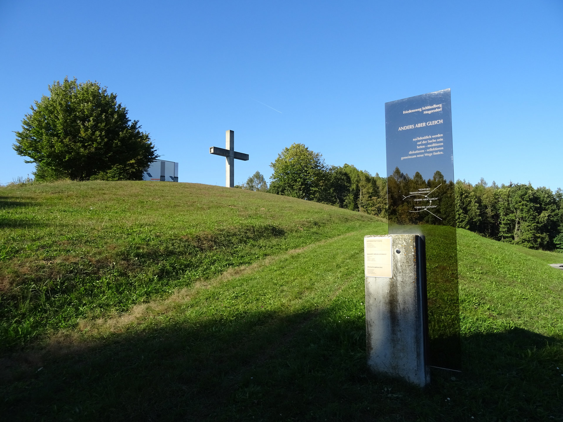 Gedenkstätte Schlösslberg: Den Höhepunkt des Friedensweges bildet die Neugestaltung der ehemaligen Schlösslkapelle, die im Zweiten Weltkrieg zerstört wurde. Der schlichte weiße Kubus, entworfen von Ottokar Uhl, und das mächtige christliche Kreuz sind eine in der Landschaft weithin sichtbare Erscheinung.