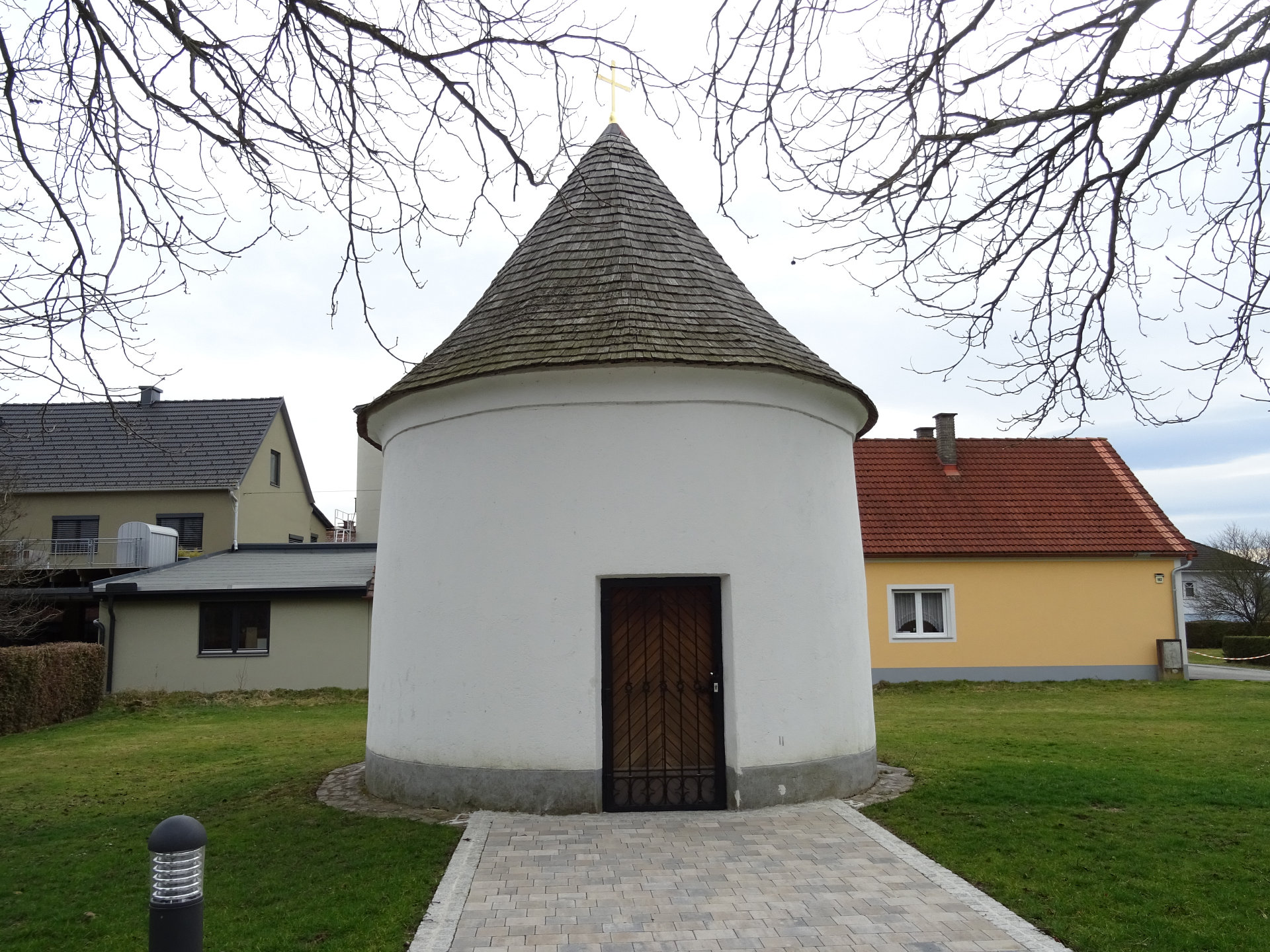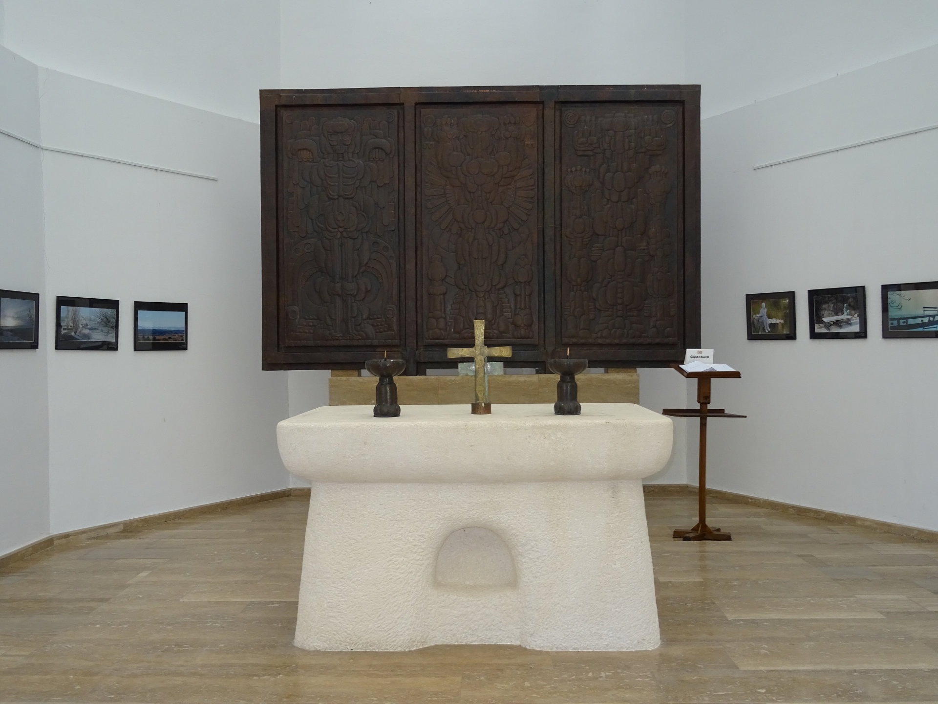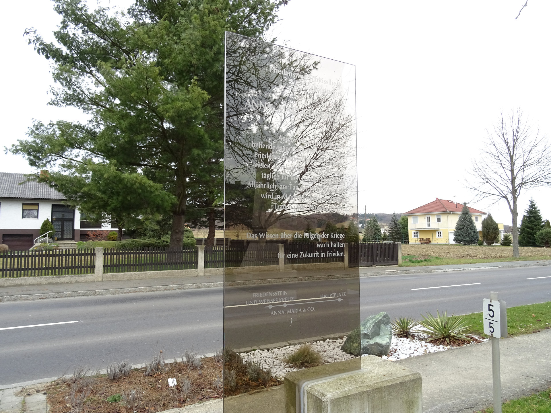 Gedenkstätte Schlösslberg: Den Höhepunkt des Friedensweges bildet die Neugestaltung der ehemaligen Schlösslkapelle, die im Zweiten Weltkrieg zerstört wurde. Der schlichte weiße Kubus, entworfen von Ottokar Uhl, und das mächtige christliche Kreuz sind eine in der Landschaft weithin sichtbare Erscheinung.