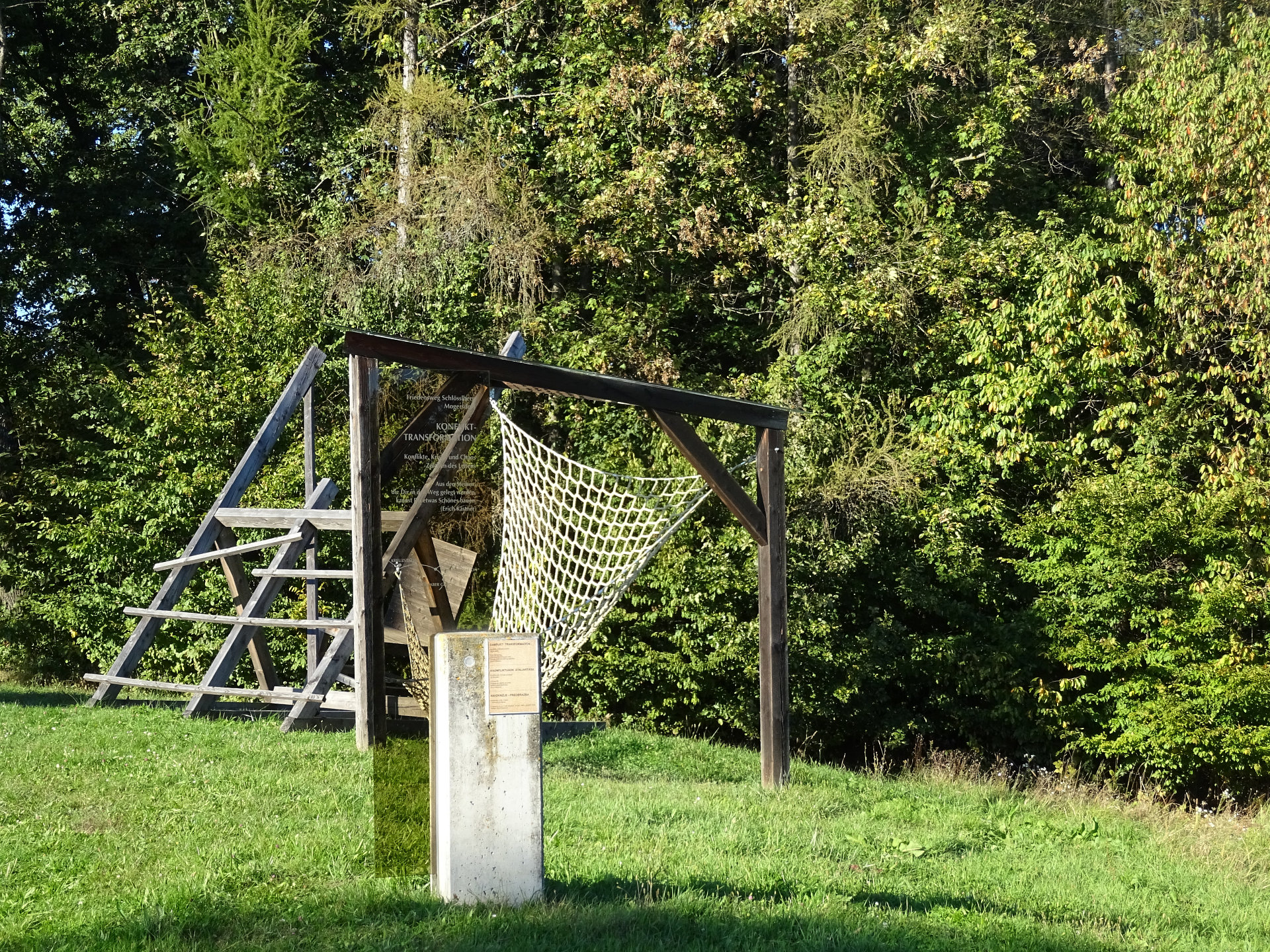Am westlichen Ortsbeginn von Mogersdorf befindet sich die Station "Friedensstein und Weises Kreuz". Das Weiße Kreuz von 1840 und der Friedensstein von 1984 sympolisieren das Grundthema des Friedensweges. Nur wenige Meter davon entfernt liegt die "Annakapelle", welche zum Gedenken an den christlichen Sieg um das Jahr 1670 errichtet wurde. Das Ölbild der heiligen Anna trägt eine Inschrift aus dem Jahr 1664. Man durchwandert Mogersdorf, und biegt vor der 1775 erbauten Pfarrkirche hl. Josef links Richtung Schlösslberg ab. Die 1. Station ist "Aufeinander schaun" und liegt am Waldrand. Hier findet man eine Geisterwand, mehrere Kaleidoskope, ein überdimensionales Glockenspiel und eine Hangrutsche. Eine weitere Station ist "EPU - European Peace University Perspectives", hier werden Arbeiten zum Thema Frieden in Form von Bildern und Collagen gezeigt. Im Hang eingebettet, liegt die Station "Anders aber gleich", eine kreisrunde Holzlamellenbank, welche einlädt, sich physisch in Gebetshaltungen verschiedener Kulturen zu begeben. Konflikttransformation. Als nächstes gelangt man zur Station "Konflikt-Transformation" - ein schiefer Sessel neben einem umgestürzten Haus signalisiert Konflikt und Chaos.