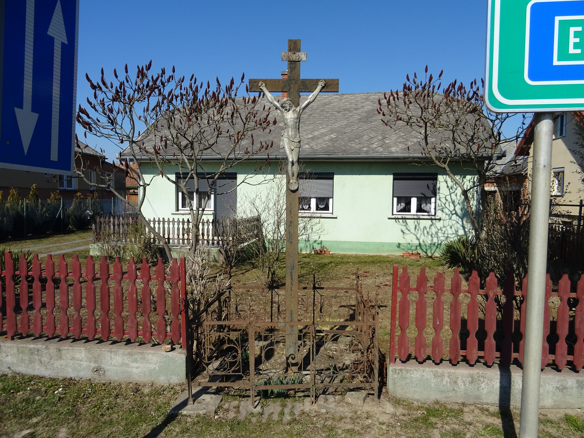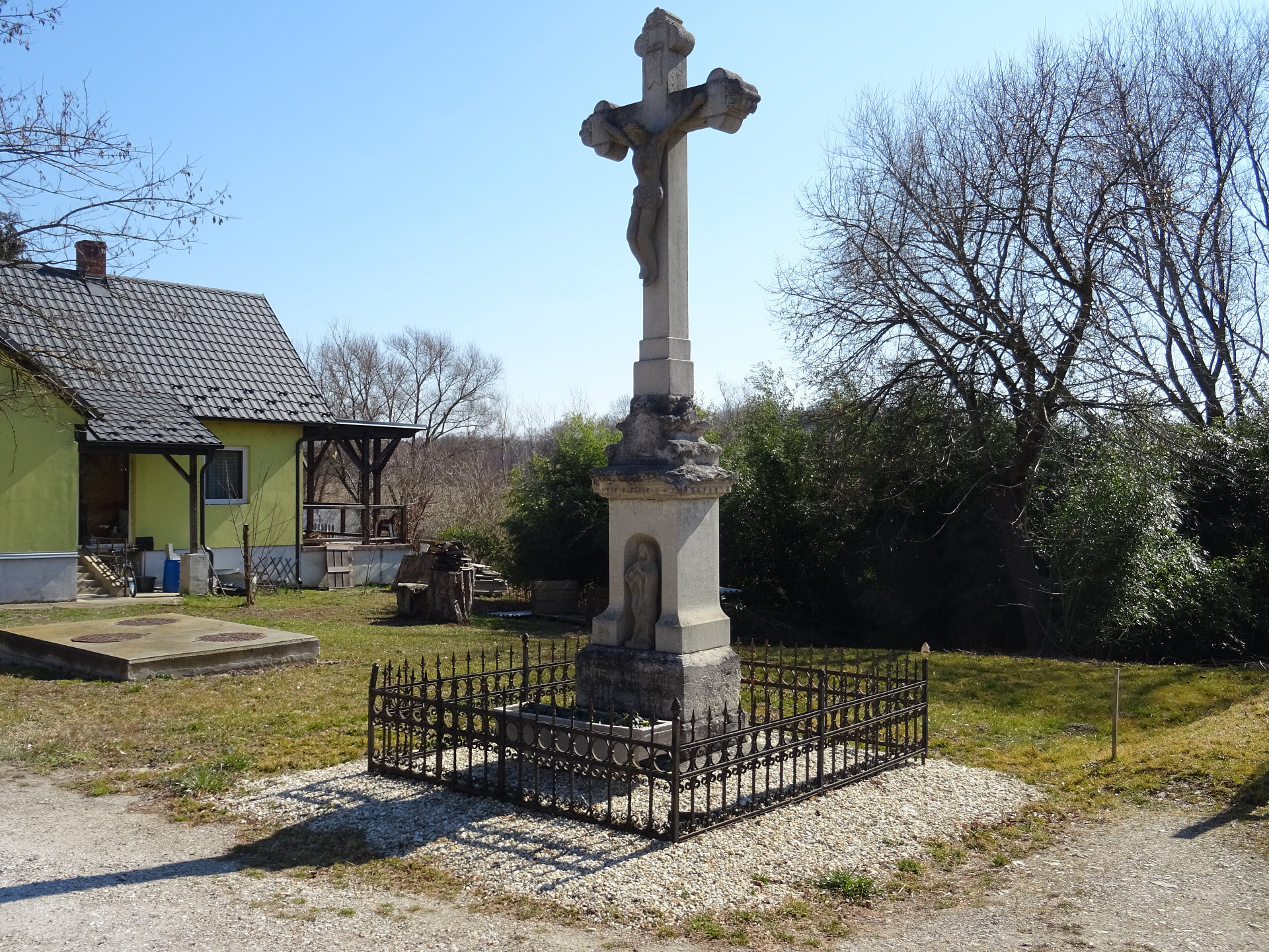 Kreuz: Das hölzerne Kreuz befindet sich an der Negyvennyolcas utca in Körmend-Horvátnádalja. Es ist mit einem Eisengitter umgeben.