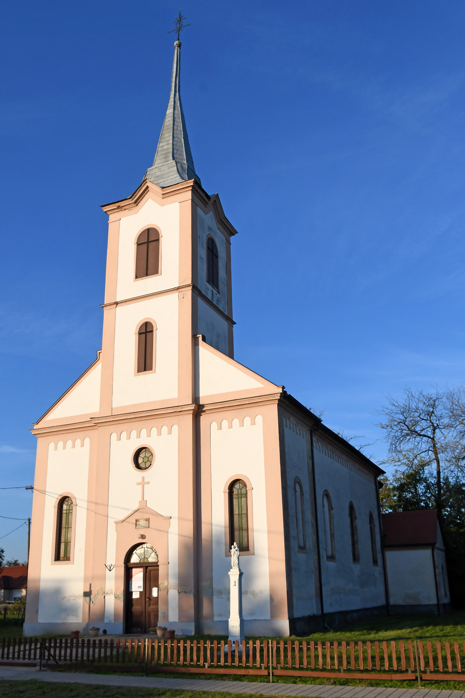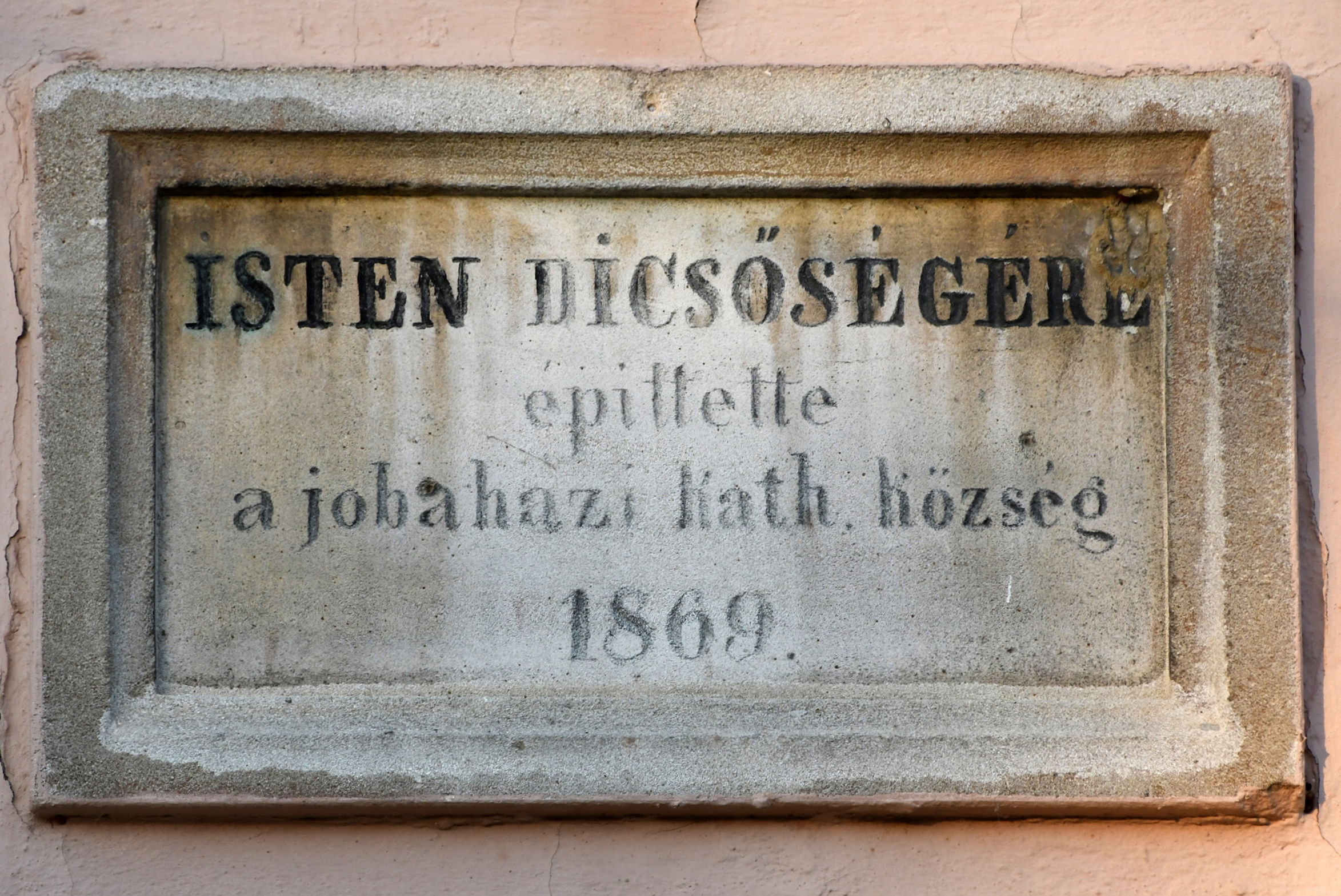 Gedenktafel an der Kirche: Die Gedenktafel befindet sich an der Kirche. Die Inschrift lautet: "ISTEN DICSŐSÉGÉRE épittette a jobahazi kath. község 1869" (1869 von der katholischen Gemeinde Jobaháza zur Ehre Gottes erbaut).