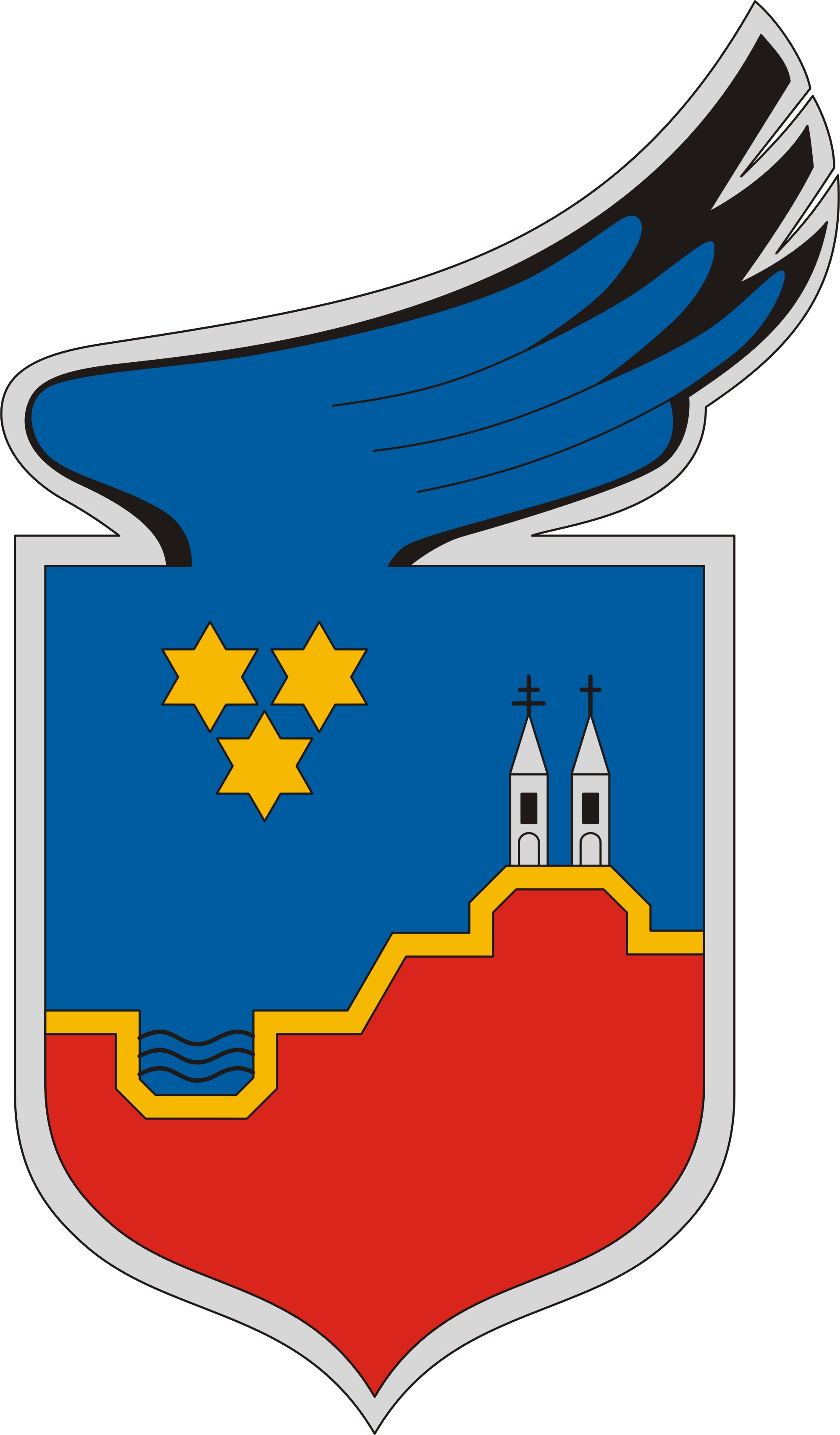 Eine stilisierte Darstellung der roten Kaviche füllt den unteren Teil des Schildes, auf dem die gesamte Landschaft ruht. Der Hügel, auf dem die beiden Kirchen stehen, folgt absichtlich den Konturen der ungarischen Heiligen Krone. Es gibt eine mündliche Überlieferung, dass die Heilige Krone während des Zweiten Weltkriegs hierher kam. Die mündliche Überlieferung beruht auf der Verehrung der Krone. Dieses Gefühl ist für uns wichtiger als die Tatsache, ob sie tatsächlich hier war oder nicht. Die beiden Kirchen sind ein Symbol für das entstandene Dorf und die beiden Gemeinden, die hier leben. Der Stern ist ein Symbol der Hoffnung und der Beständigkeit. Auf dem Wappen sind drei Sterne zu sehen. Die Dreifaltigkeit hat viele Bedeutungen (Dreifaltigkeit, Glaube - Hoffnung - Liebe, Vergangenheit - Gegenwart - Zukunft, Mann - Frau - Kind). Alle diese dreifachen Beziehungen sind Ausdruck gegenseitiger Abhängigkeit und Gleichheit.