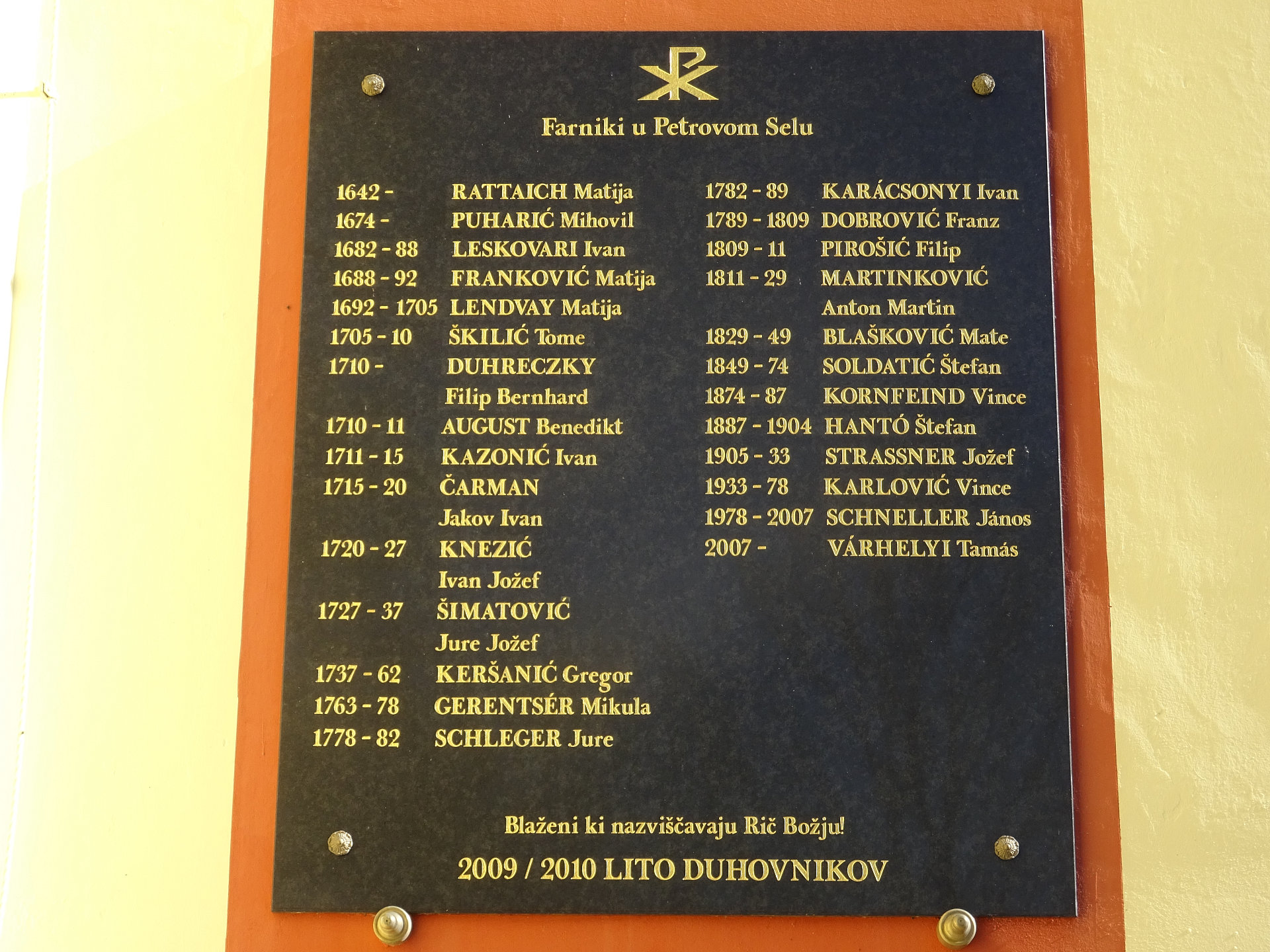 Die Gemeindepfarrer (Plébánosok) waren laut der Tafel bei der Kirche: