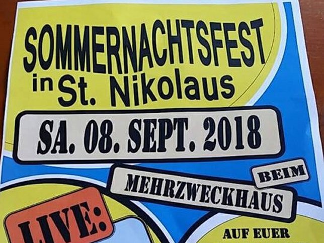 Das 1. Sommernachtsfest findet beim Mehrzweckhaus (Hausnummer 30) in St. Nikolaus statt. Ab 20 Uhr sorgen die "Schleifer" für gute Stimmung und Musik. Für Speis und Trank wird gesorgt, natürlich gibt es auch einen Barbetrieb. Der Brauchtumspflegeverein St. Nikolaus freut sich auf Euer Kommen.