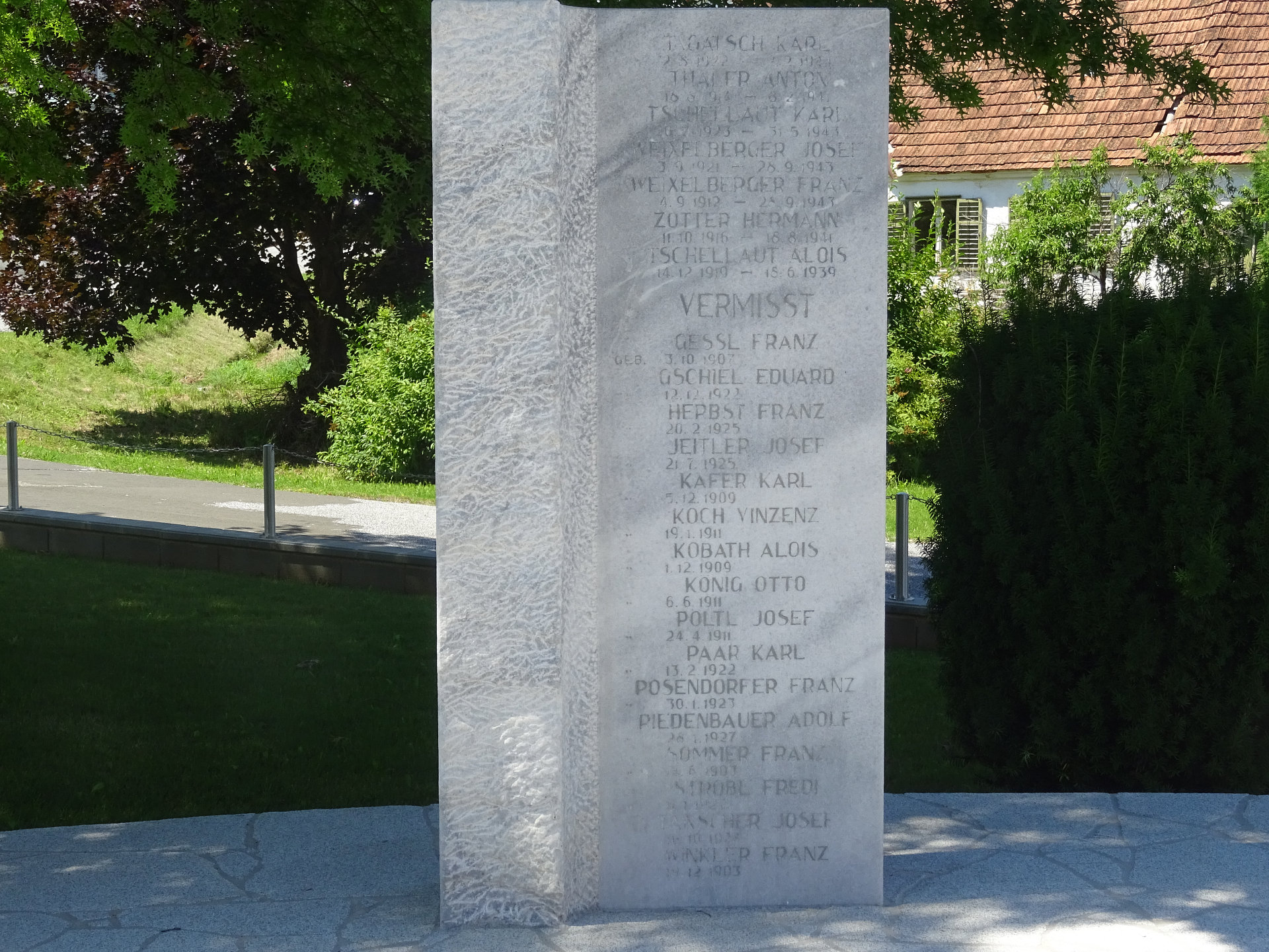 Die Namen der Gefallenen und Vermissten im 2. Weltkrieg lauten: GESSL Franz 03.10.1907 vermisst, GESSL Ludmilla 05.09.1905 19.04.1945, GSCHIEL Alois 24.08.1912 11.06.1943, GSCHIEL Eduard 12.12.1922 vermisst, GSCHIEL Franz 24.12.1910 29.12.1942, GWANDNER Franz 31.07.1913 04.11.1940, HERBST Franz 20.02.1925 vermisst, JAKUM Josef 05.04.1909 26.10.1945, JEITLER Josef 21.07.1925 vermisst, KÄFER Karl 05.12.1909 vermisst, KAINZ Alois 02.05.1903 03.03.1945, KOBATH Alois 01.12.1909 vermisst, KOCH Vinzenz 19.01.1911 vermisst, KÖNIG Otto 06.06.1911 vermisst, LEPOLD Josef 03.06.1921 11.09.1942, MAIERHOFER Franz 11.06.1921 02.04.1944, MÜLLNER Alois 17.03.1905 19.04.1945, NEUHOLD Franz 05.03.1917 14.04.1944, OSWALD Alois 05.05.1910 16.03.1942, PAAR Karl 13.02.1922 vermisst, PASSINY Paul 29.12.1924 29.03.1944, PEINDL Franz 13.11.1921 29.06.1941, PEINSIPP Ignaz 10.09.1914 03.09.1943, PFINGSTL Franz 03.01.1918 12.07.1941, PICHLER Anton 27.07.1922 24.08.1942, PICHLER Josef 27.05.1910 16.05.1944, PICHLER Walter 09.01.1922 24.10.1943, PÖLTL Josef 24.04.1911 vermisst, PÖSENDORFER Franz 30.01.1923 vermisst, RATH Alois 24.12.1916 14.10.1942, RIEDENBAUER Adolf 28.01.1927 vermisst, SCHANTL Josef 28.08.1913 06.03.1944, SCHANTL Karl 13.12.1916 15.03.1942, SOMMER Franz 14.06.1903 vermisst, SOMMER Josef 16.04.1920 05.02.1945, STROBL Fredi 06.01.1927 vermisst, TAGATSCH Karl 02.08.1922 02.02.1944, TANSCHER Friedrich 29.08.1921 22.09.1941, TANSCHER Josef 16.10.1924 vermisst, THALER Anton 18.08.1914 08.02.1941, TSCHELLAUT Alois 14.12.1919 18.06.1939, TSCHELLAUT Karl 20.07.1923 31.05.1943, TSCHELLAUT Karl 28.03.1905 22.11.1943, WEIXELBERGER Franz 04.09.1912 28.09.1943, WEIXELBERGER Josef 03.09.1921 28.09.1943, WINKLER Franz 19.12.1903 vermisst und ZOTTER Hermann 11.10.1916 18.08.1941.
