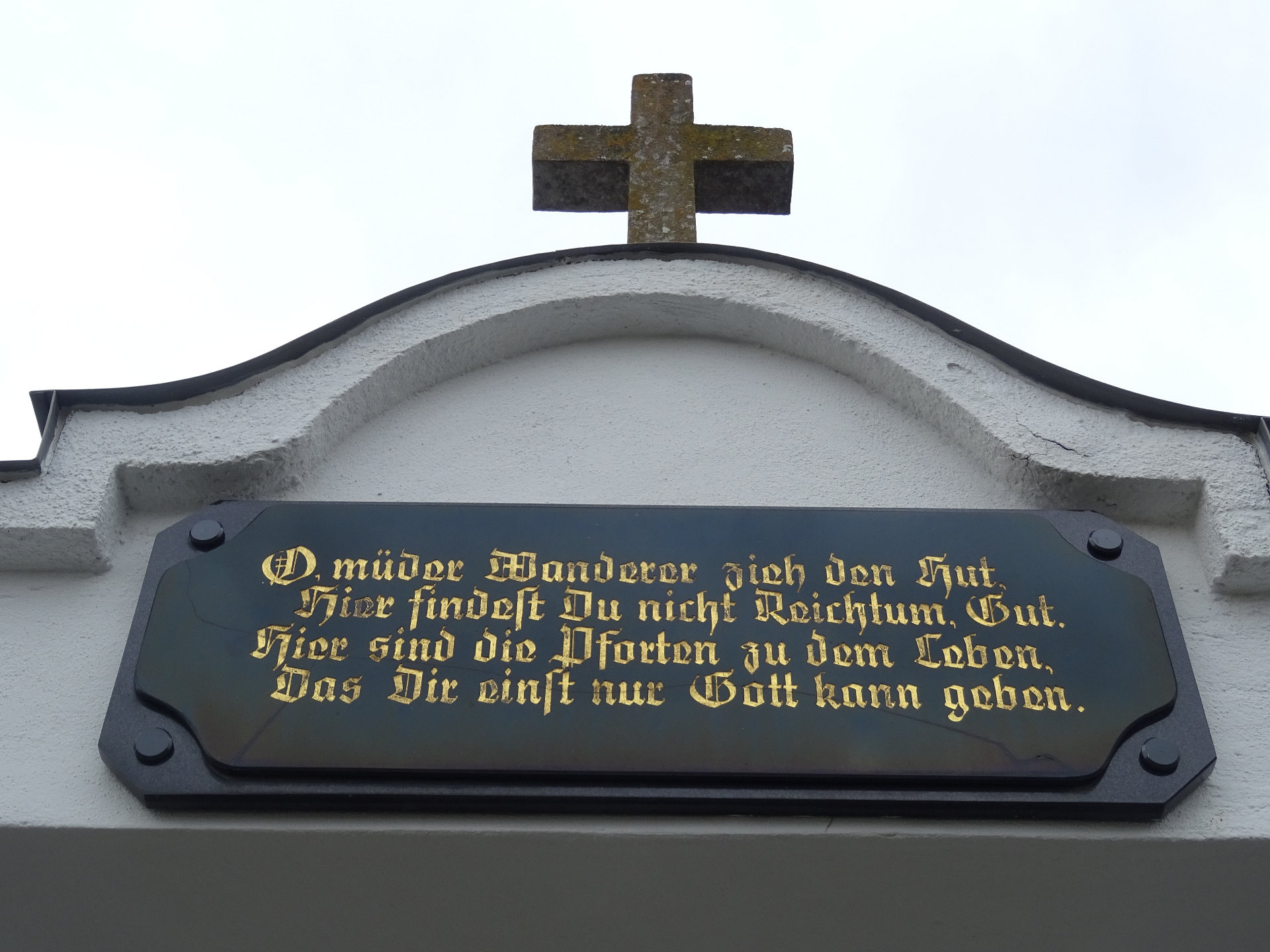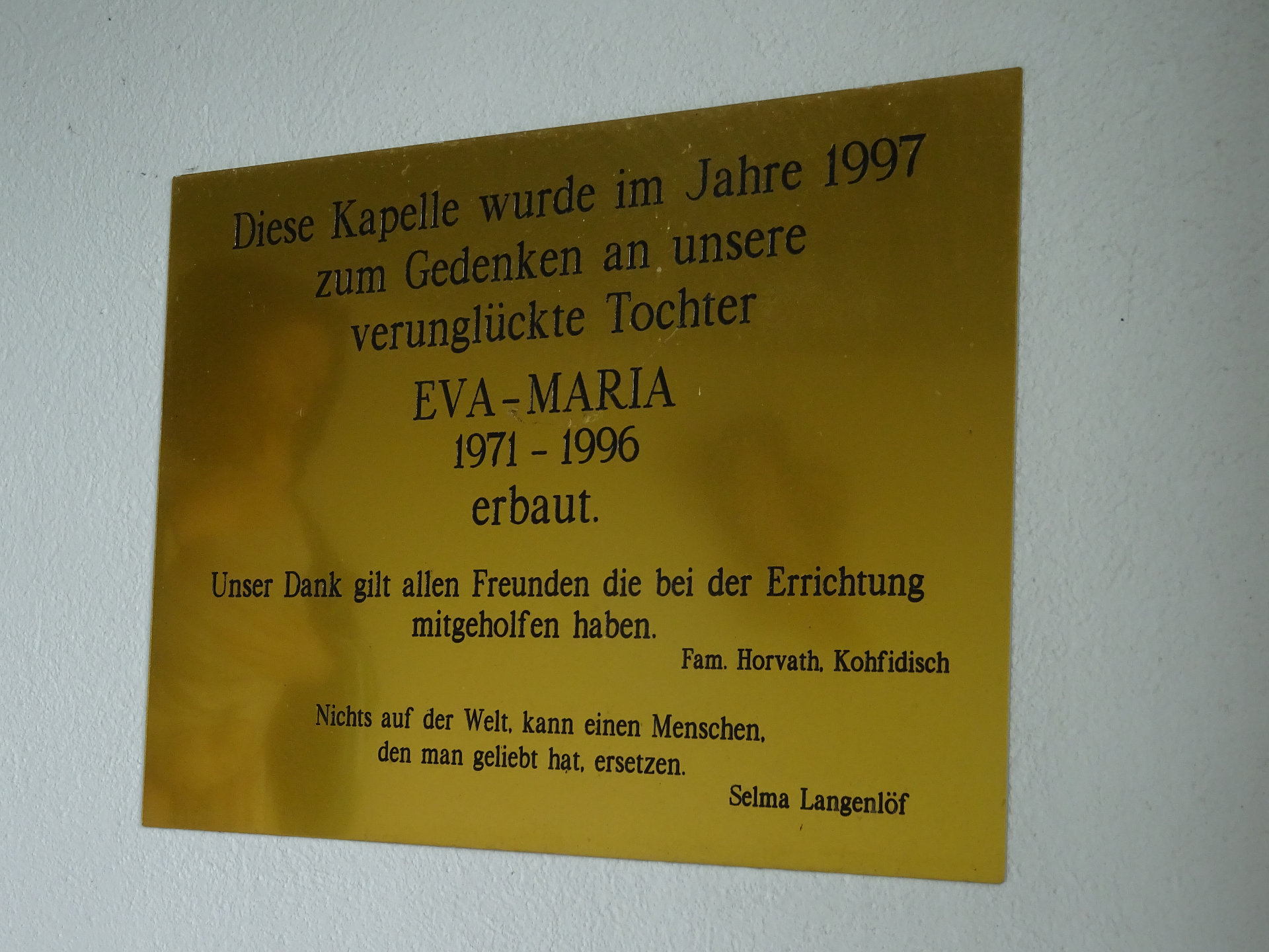Die Inschrift lautet: "Diese Kapelle wurde im Jahre 1997 zum Gedenken an unsere verunglückte Tochter EVA-MARIA 1971-1996 erbaut. Unser Dank gilt allen Freunden die bei der Errichtung mitgeholfen haben. Fam Horvath. Kohfidisch.