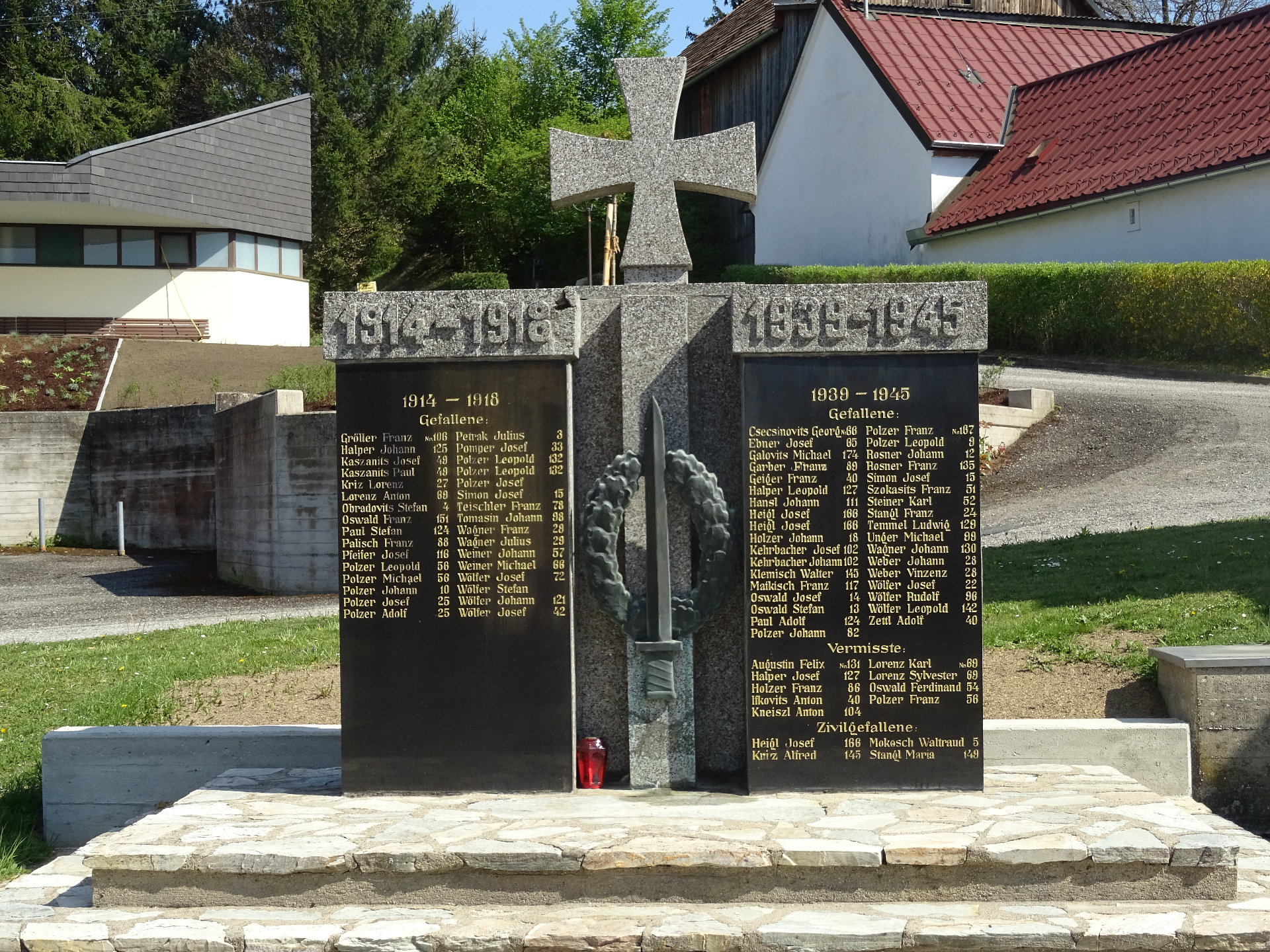 Das Soldatendenkmal befindet sich neben der Kirche. Rechteckiges Denkmal auf Bruchsteinsockel, gekrönt mit Steinkreuz in der Mitte Bronze-Lorbeerkranz mit Schwert.Kohfidisch, Kriegerdenkmal
