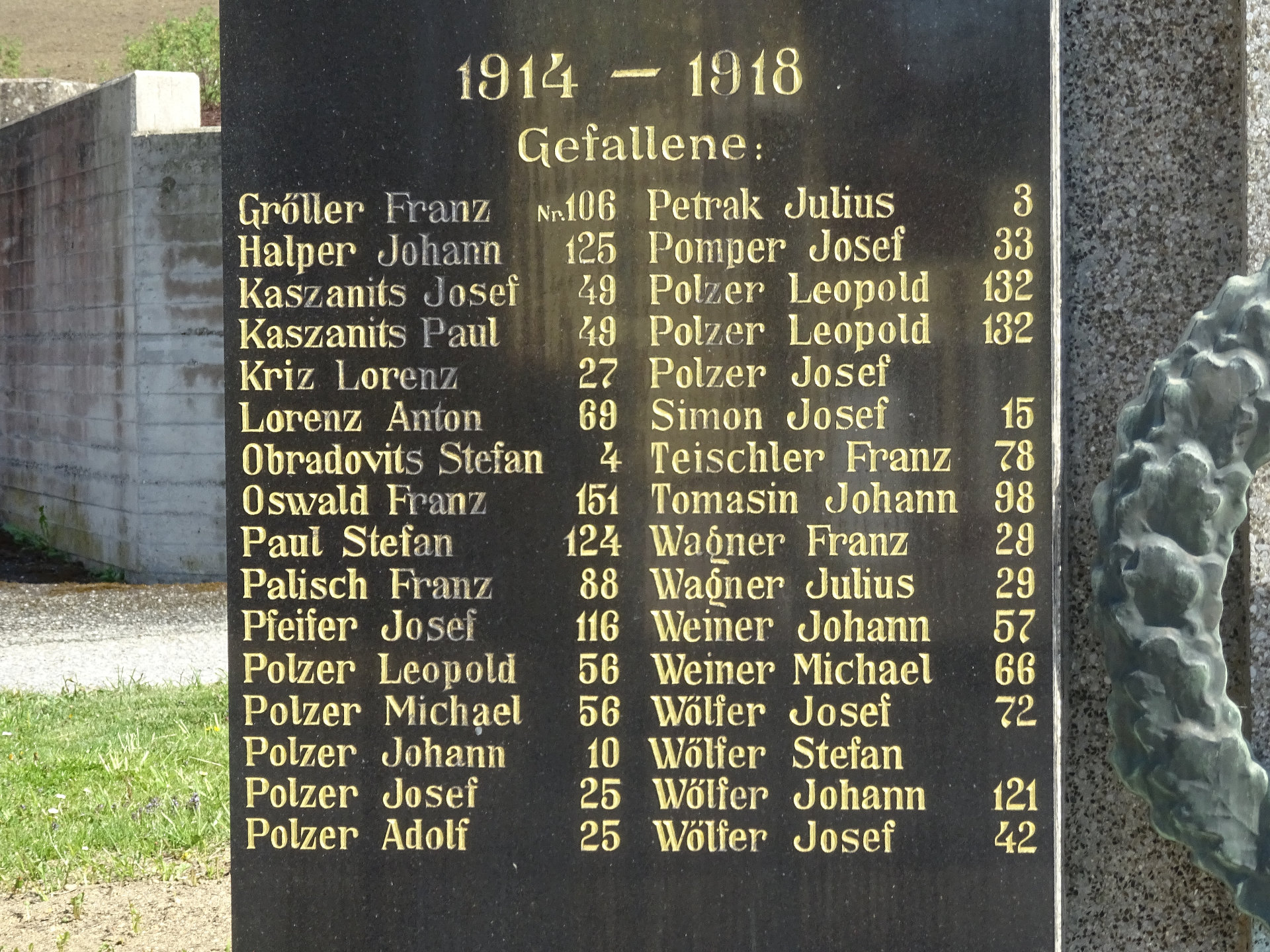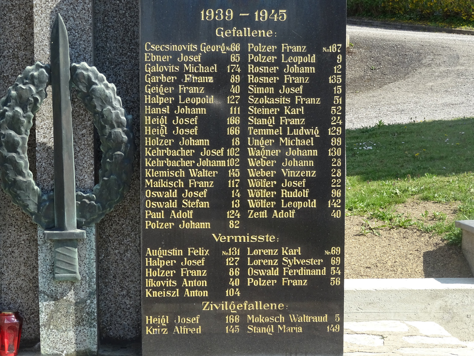Das Soldatendenkmal befindet sich neben der Kirche. Rechteckiges Denkmal auf Bruchsteinsockel, gekrönt mit Steinkreuz in der Mitte Bronze-Lorbeerkranz.Kohfidisch, Eva-Maria Horvath-Kapelle