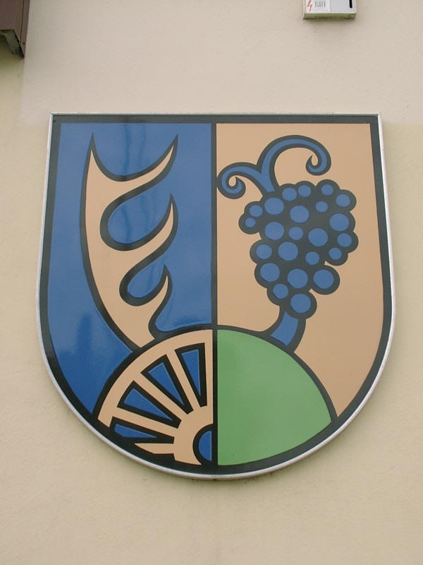 Wappen: Das am 9. Mai 1982 verliehene Wappen zeigt: "In dem von Blau und Gold gespaltenen Schild vorne aus einem Radviertel eine goldene Hirschstange wachsend, hinten aus einem grünen Bergviertel ein blauer Rebstock wachsend."