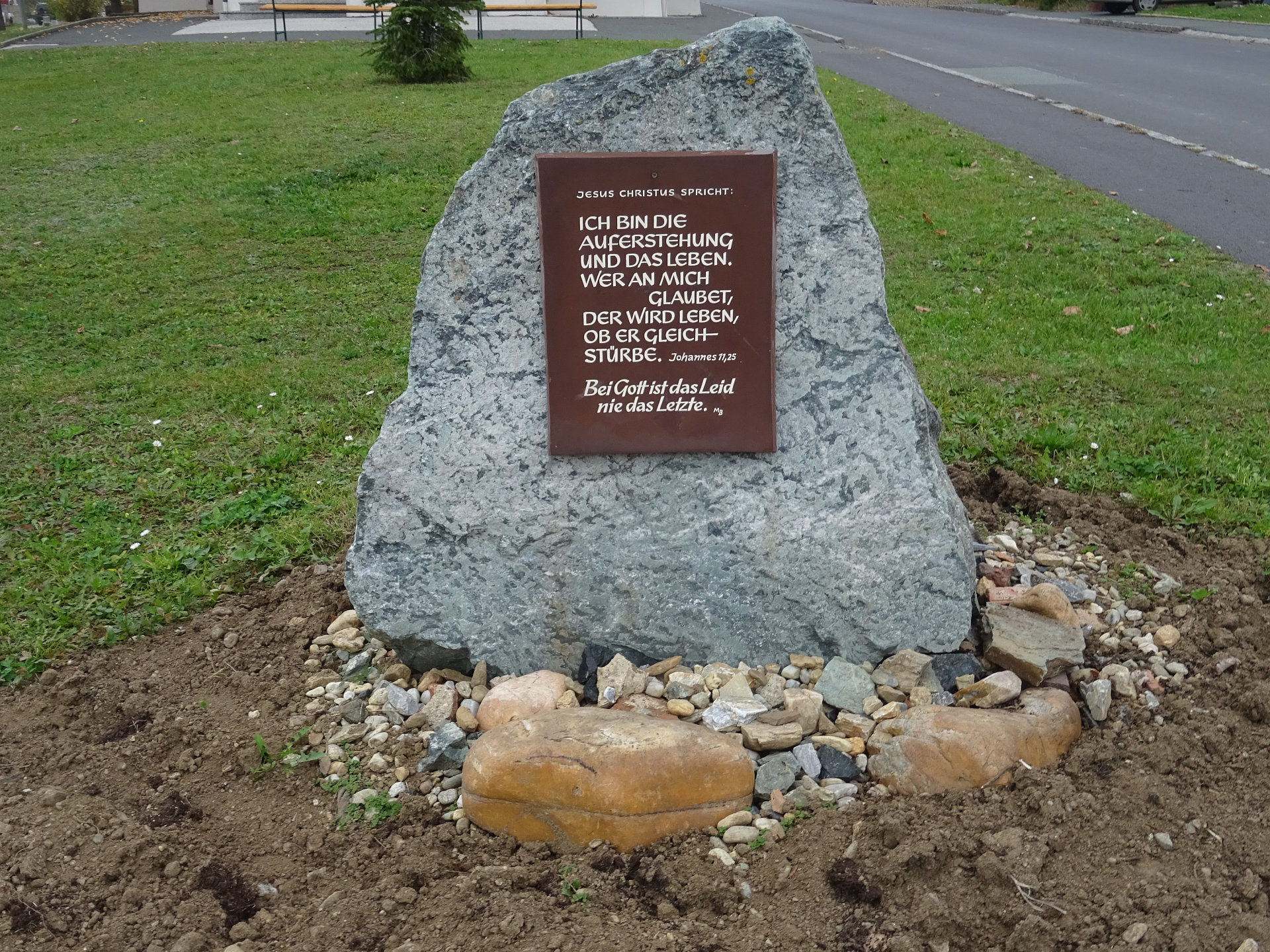 Gedenkstein 'Auferstehung' in Spitzzicken, vor der Kirche.Spitzzicken, Gedenkstein 'Alles Land'